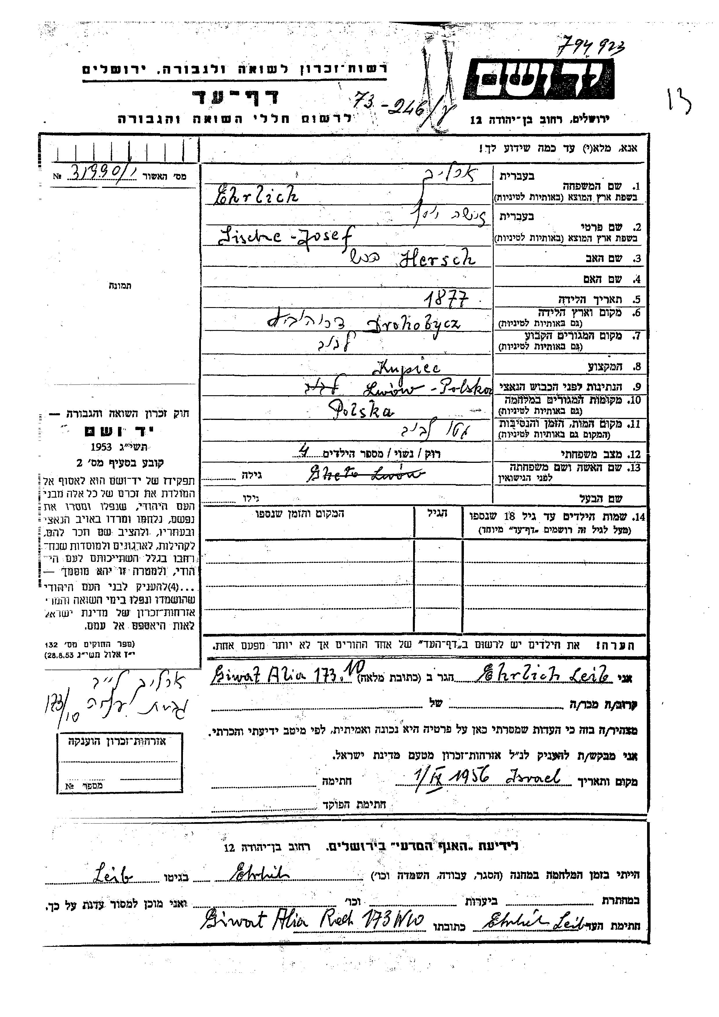 Zische Josef Ehrlich wurde im Jahr 1877 in Drohobycz, Polen geboren. Er war der Sohn von Hersch. Er war Kaufmann/-frau und Verheiratet. Vor dem Zweiten Weltkrieg lebte er in Lwow, Polen. Während des Krieges war er in Lwow, Polen.