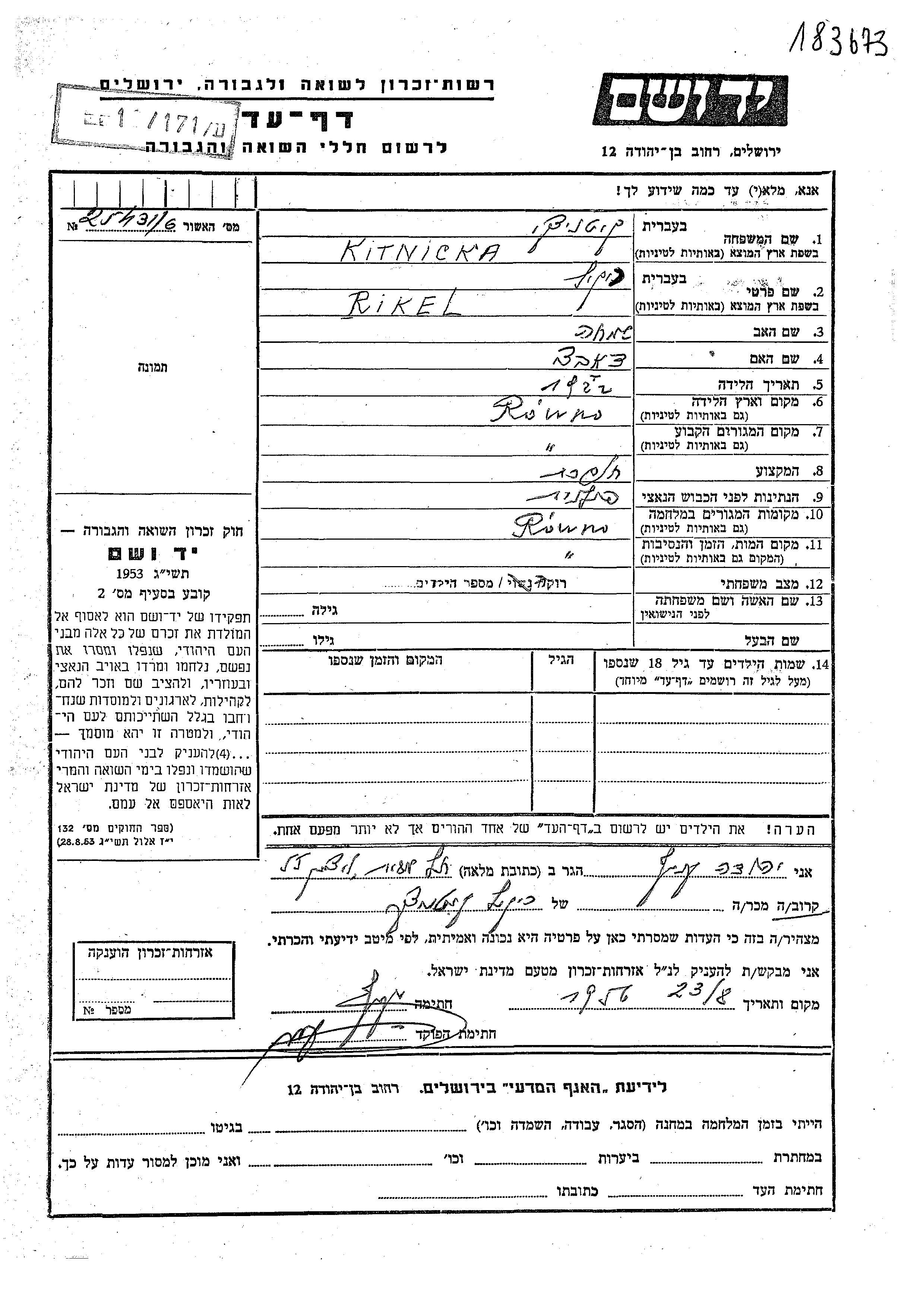 Rikel Kitnicka wurde im Jahr 1922 in Rowno, Polen geboren. Sie war die Tochter von Simkha und Dobra. Sie war Schneiderin und Ledig. Vor dem Zweiten Weltkrieg lebte sie in Rowno, Polen. Während des Krieges war sie in Rowno, Polen.