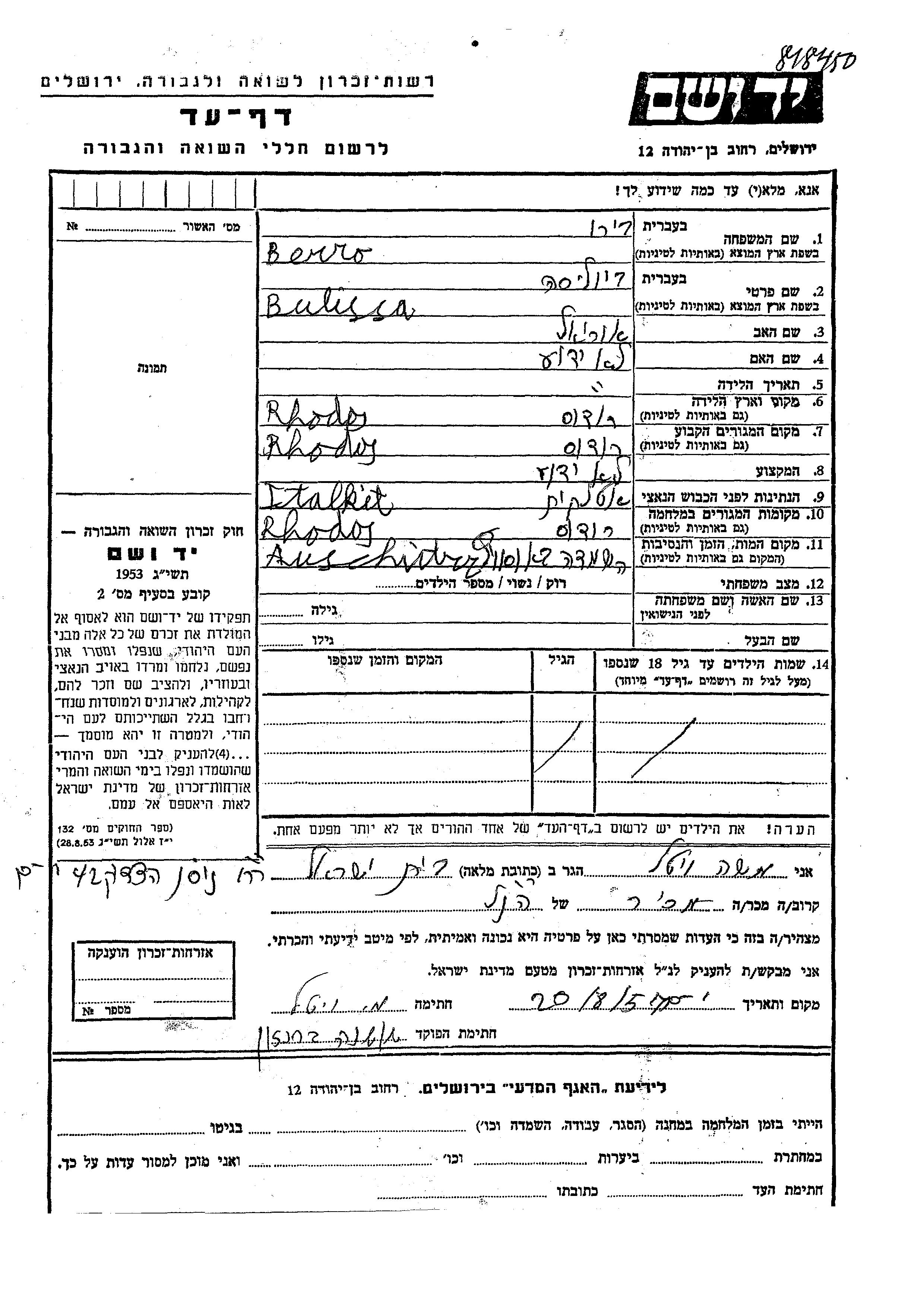 Bulisa Berro Biro wurde in Rodi, Italien geboren. Sie war die Tochter von Uriel. Vor dem Zweiten Weltkrieg lebte sie in Rodi, Italien. Während des Krieges war sie in Rodi, Italien.