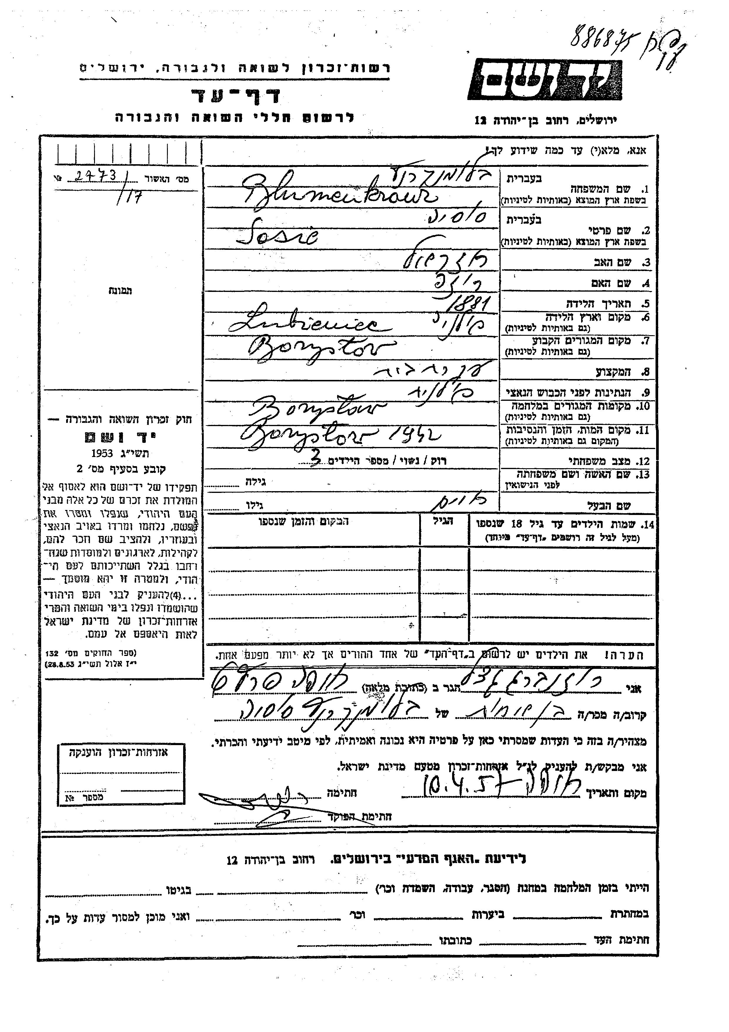 Sosie Blumenkranz wurde im Jahr 1881 in Lubieniec, Polen geboren. Sie war die Tochter von Yekhezkel und Roza. Sie war Hausfrau und mit Khaim Verheiratet. Vor dem Zweiten Weltkrieg lebte sie in Boryslaw, Polen. Während des Krieges war sie in Boryslaw, Polen.
