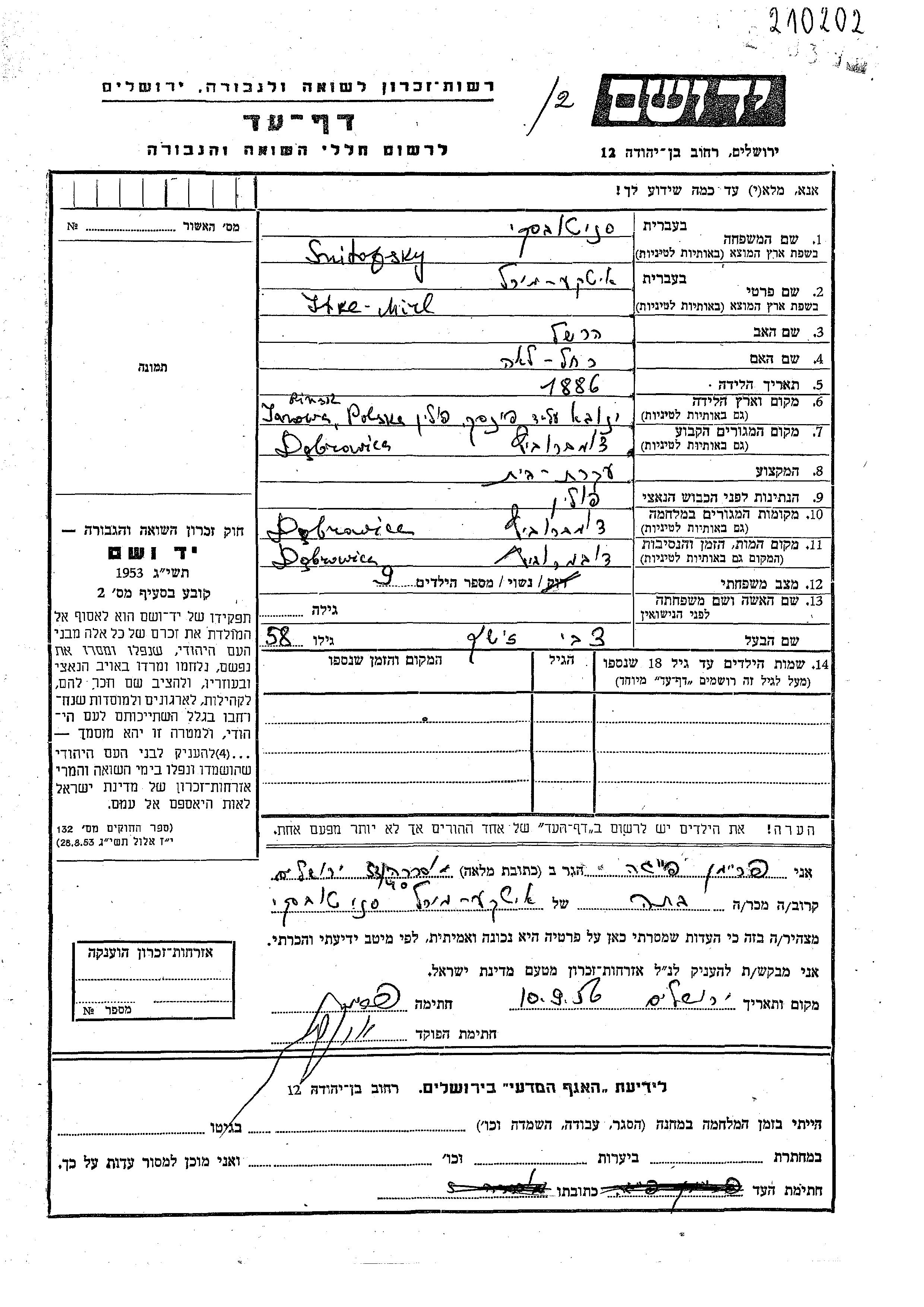 Itke Mirl Snitovsky wurde im Jahr 1886 in Janowa, Polen geboren. Sie war die Tochter von Hershel und Rakhel Lea. Sie war Hausfrau und mit Tzvi Verheiratet. Vor dem Zweiten Weltkrieg lebte sie in Dabrowica, Polen. Während des Krieges war sie in Dabrowica, Polen.
