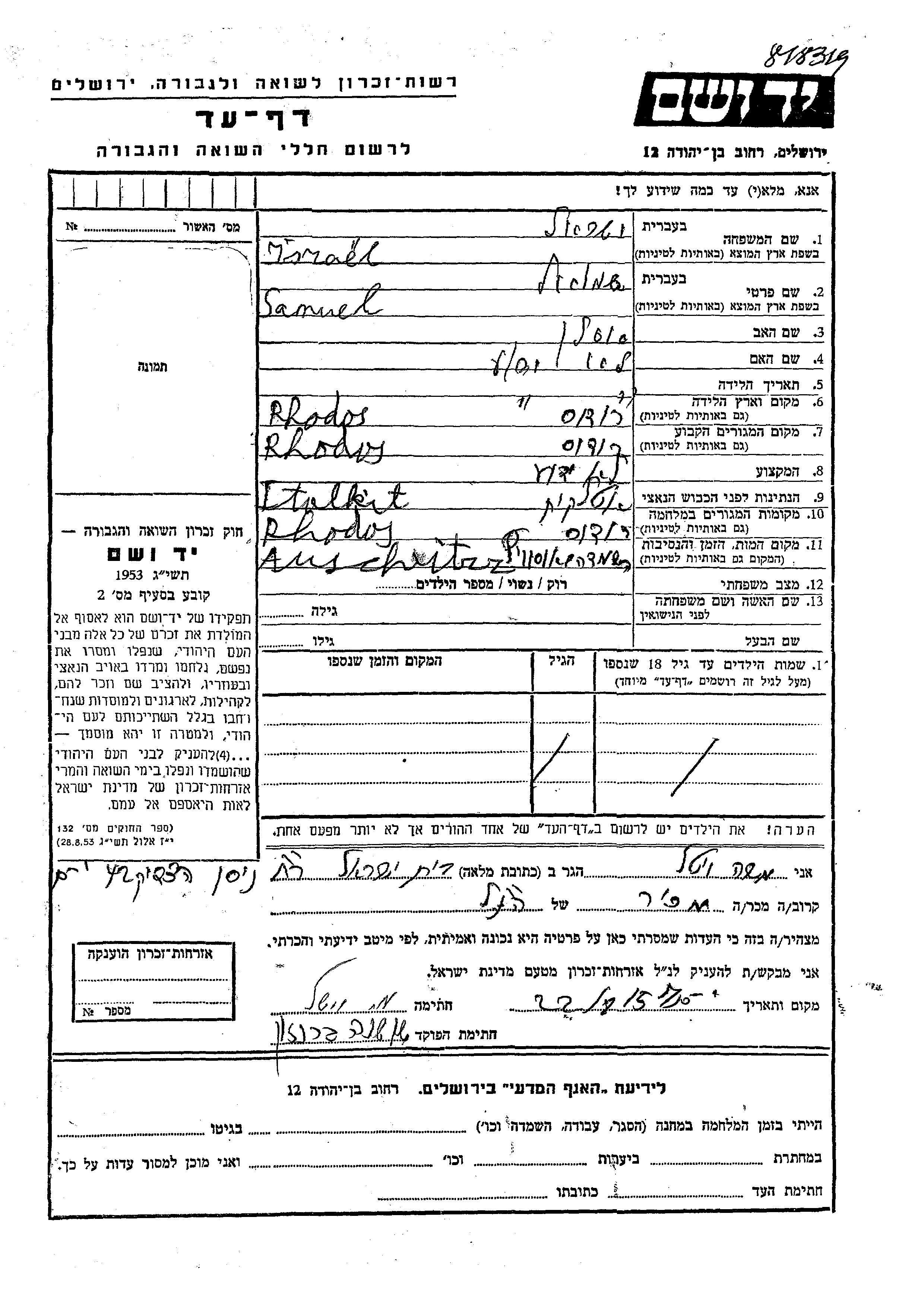 Shmuel wurde in der Schoah ermordet. Todesort: Auschwitz, Polen.