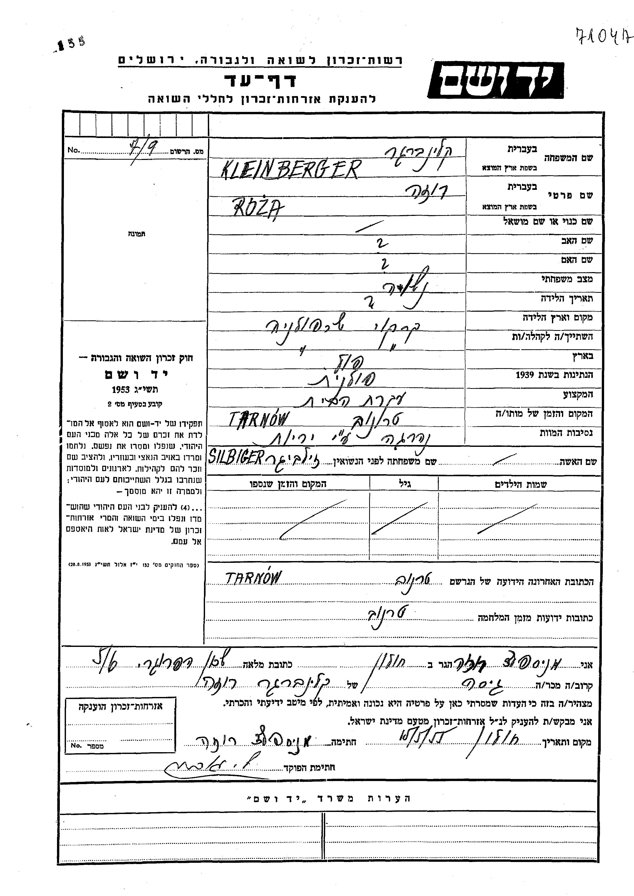 Roza Klenberger, geb. Silbiger wurde in Krakow, Polen geboren. Sie war Hausfrau. Vor dem Zweiten Weltkrieg lebte sie in Krakow, Polen. Während des Krieges war sie in Tarnow, Polen.