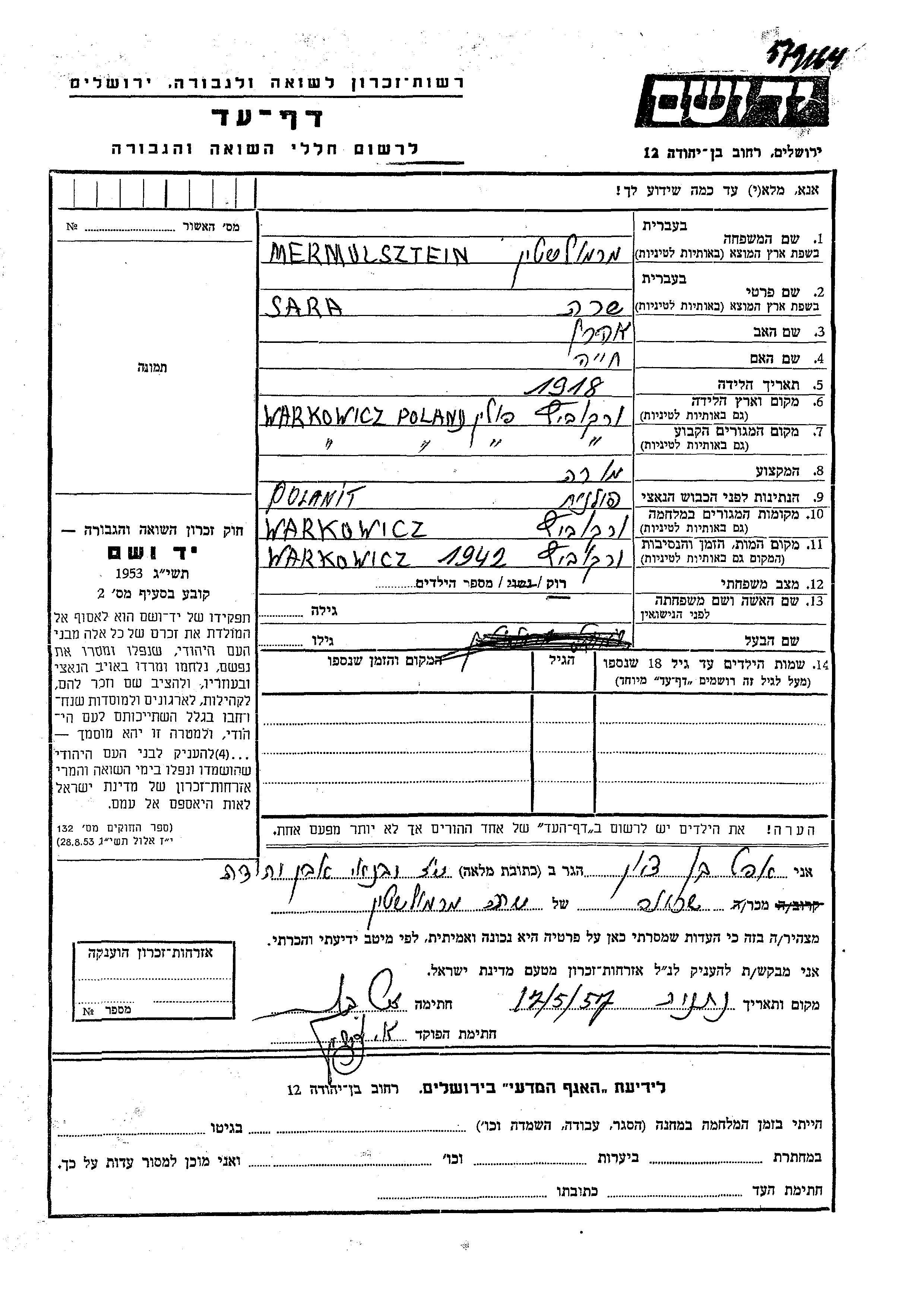 Mermulsztein Sara 1918 Warkowicze, Polen Gedenkblatt