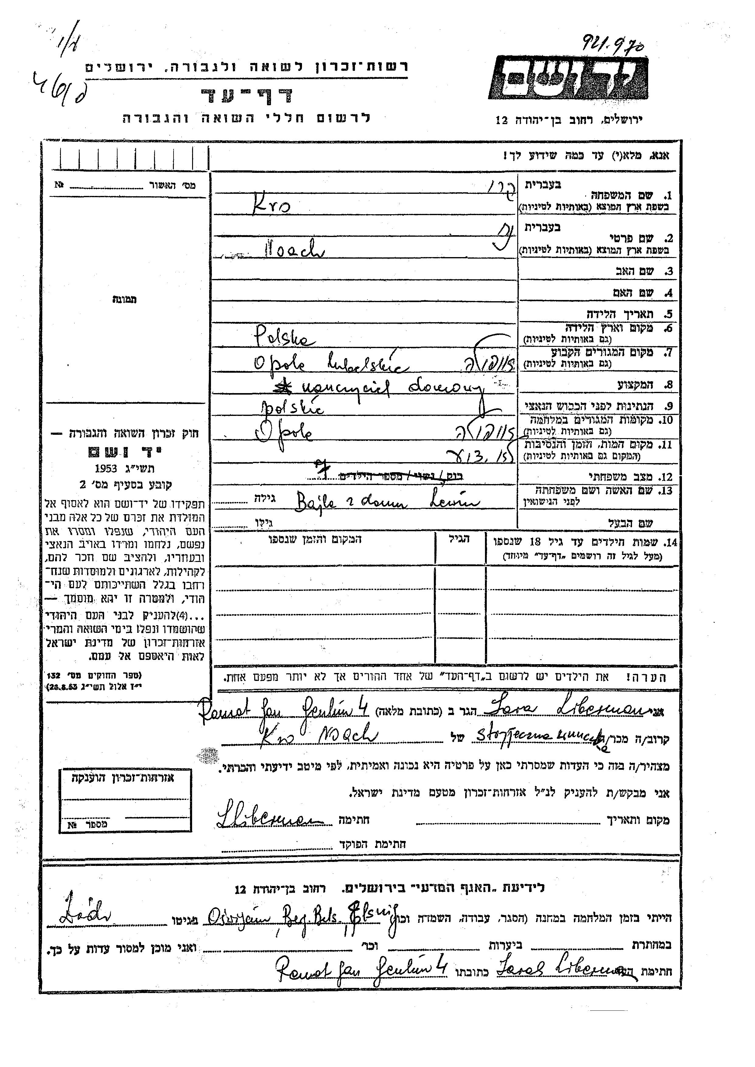 Noach Kro Karo wurde in Polen geboren. Er war Nauczyciel domowy und mit Bajla, geb. Lewin Verheiratet. Vor dem Zweiten Weltkrieg lebte er in Opole Lubelskie, Polen. Während des Krieges war er in Opole Lubelskie, Polen.