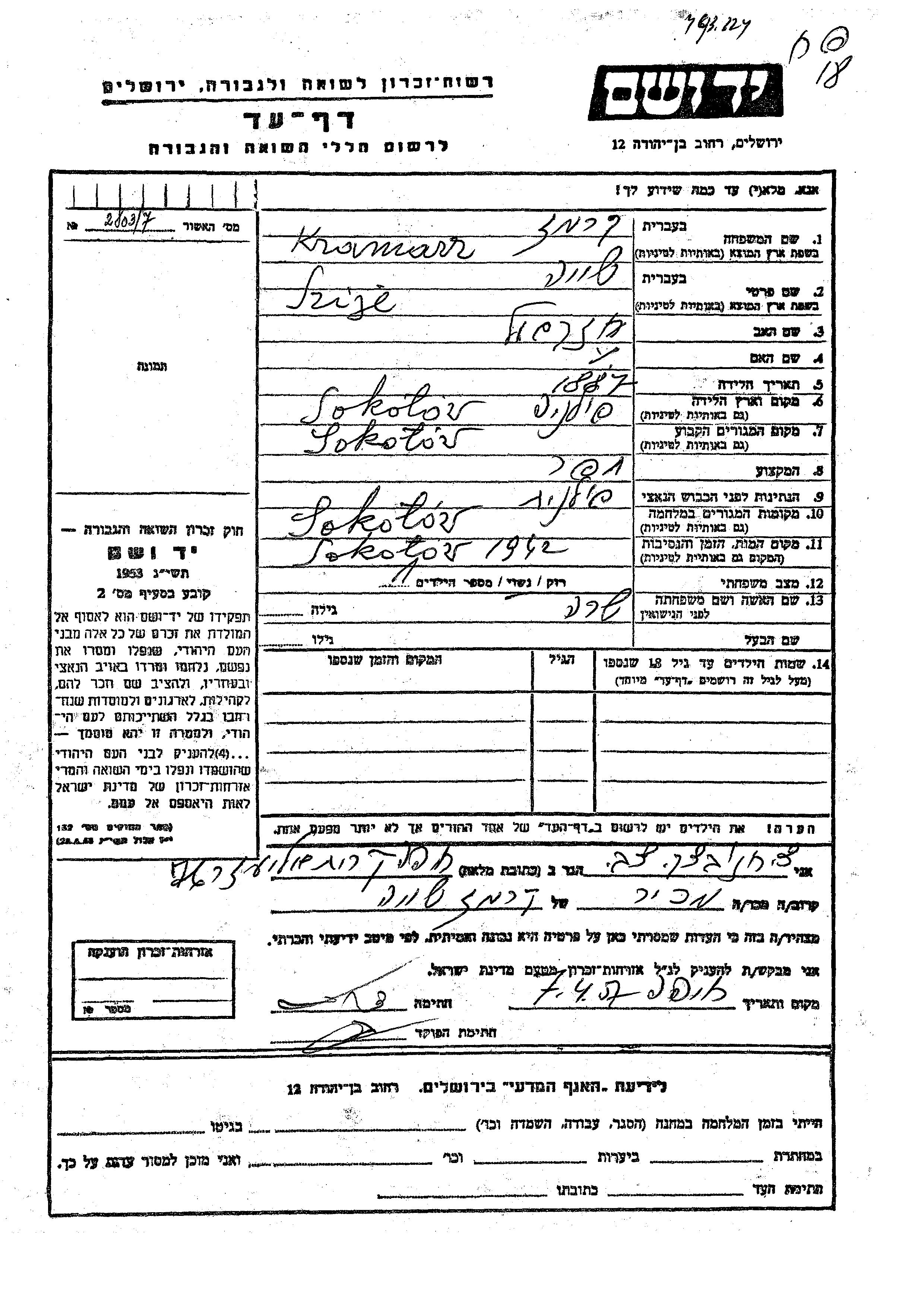 Szija wurde in der Schoah ermordet. Todesort: Sokolow, Polen im Jahr 1942.