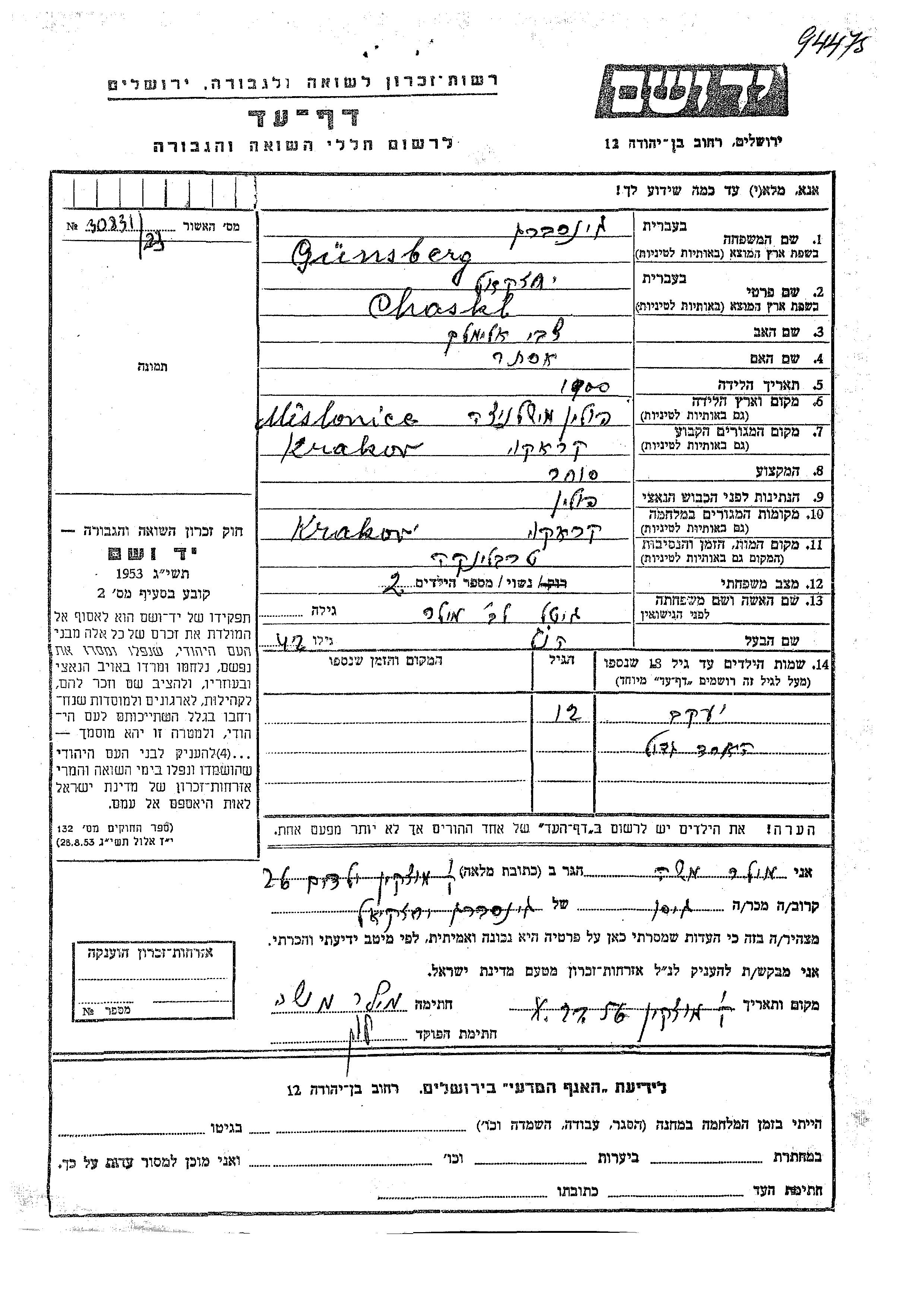 Chaskl Günsberg wurde im Jahr 1900 in Mislinice, Polen geboren. Er war der Sohn von Tzvi Elimelekh und Ester. Er war Kaufmann/-frau und mit Gitel, geb. Miler Verheiratet. Vor dem Zweiten Weltkrieg lebte er in Krakow, Polen. Während des Krieges war er in Krakow, Polen.