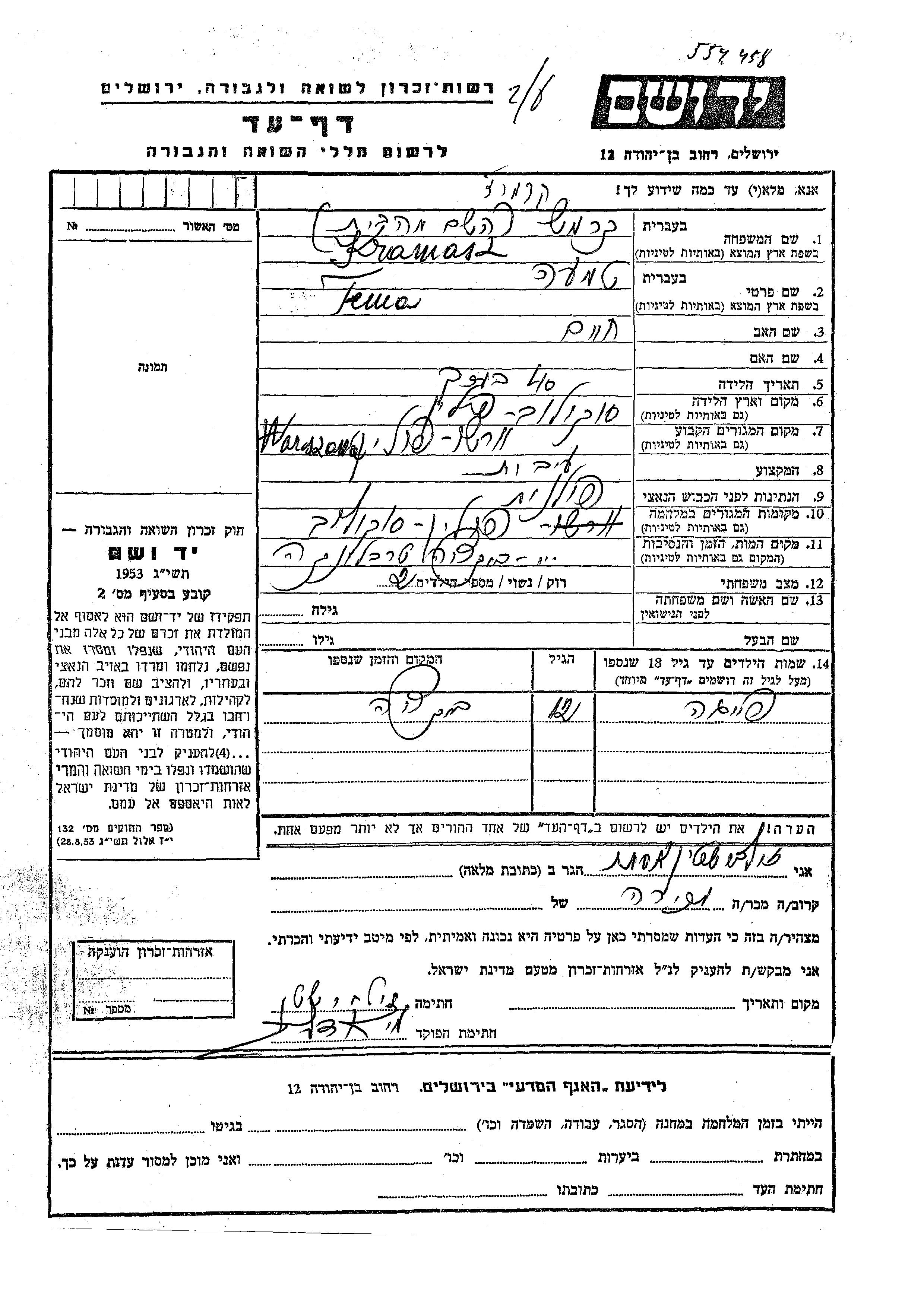 Tema wurde in der Schoah ermordet. Todesort: Treblinka, Polen.