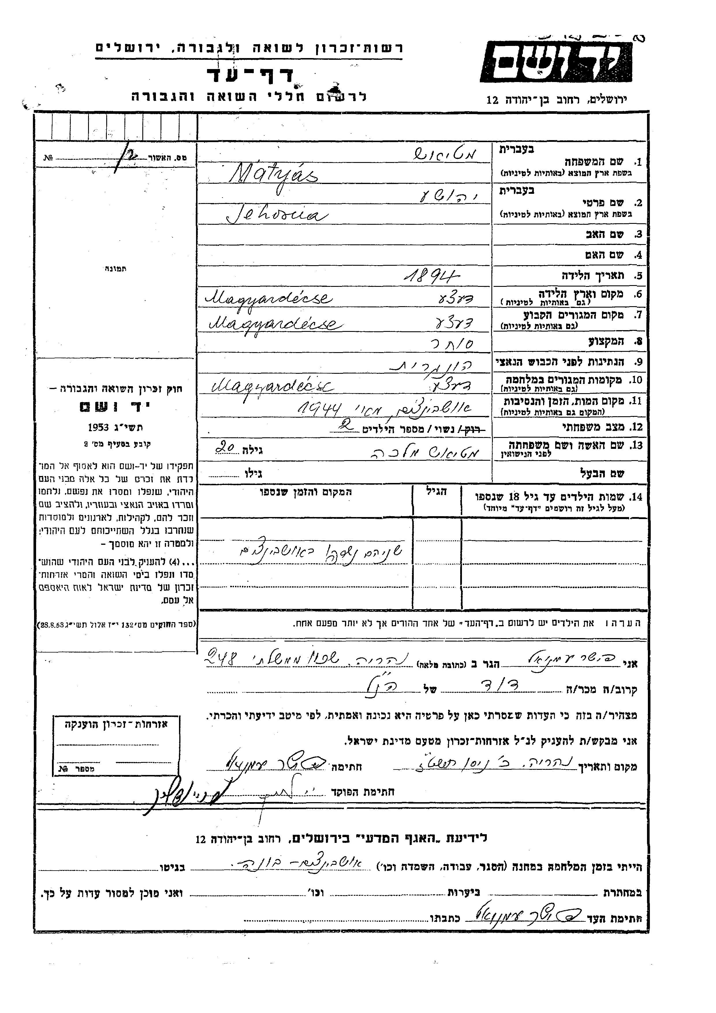 Jehosua Matyas wurde im Jahr 1894 in Magyardecse, Rumänien geboren. Er war Kaufmann/-frau und mit Malka Verheiratet. Vor dem Zweiten Weltkrieg lebte er in Magyardecse, Rumänien. Während des Krieges war er in Magyardecse, Rumänien.