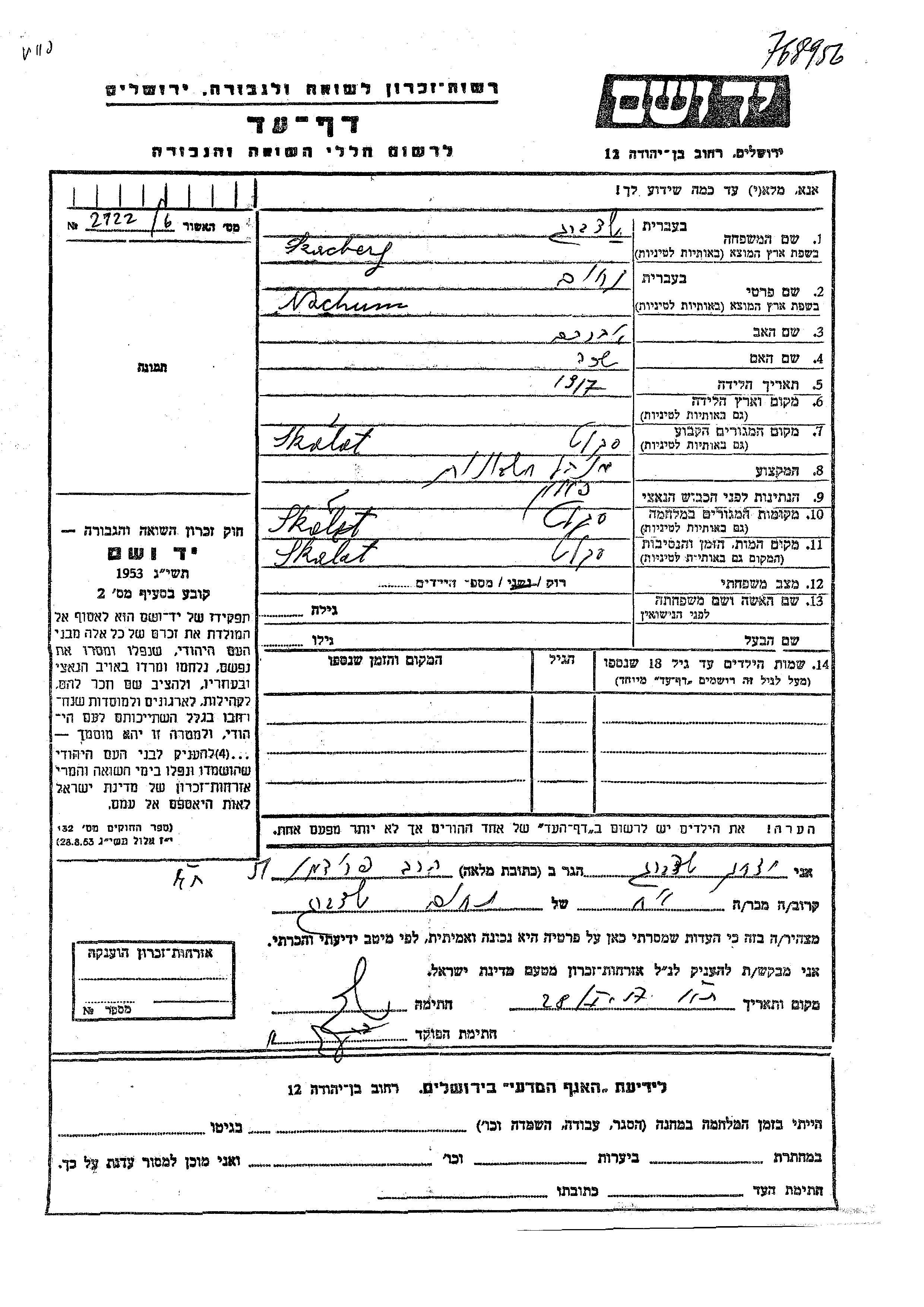 Nachum Szacberg wurde im Jahr 1917 geboren. Er war der Sohn von Avraham und Sara. Er war Buchhalter/-in und Verheiratet. Vor dem Zweiten Weltkrieg lebte er in Skalat, Polen. Während des Krieges war er in Skalat, Polen.