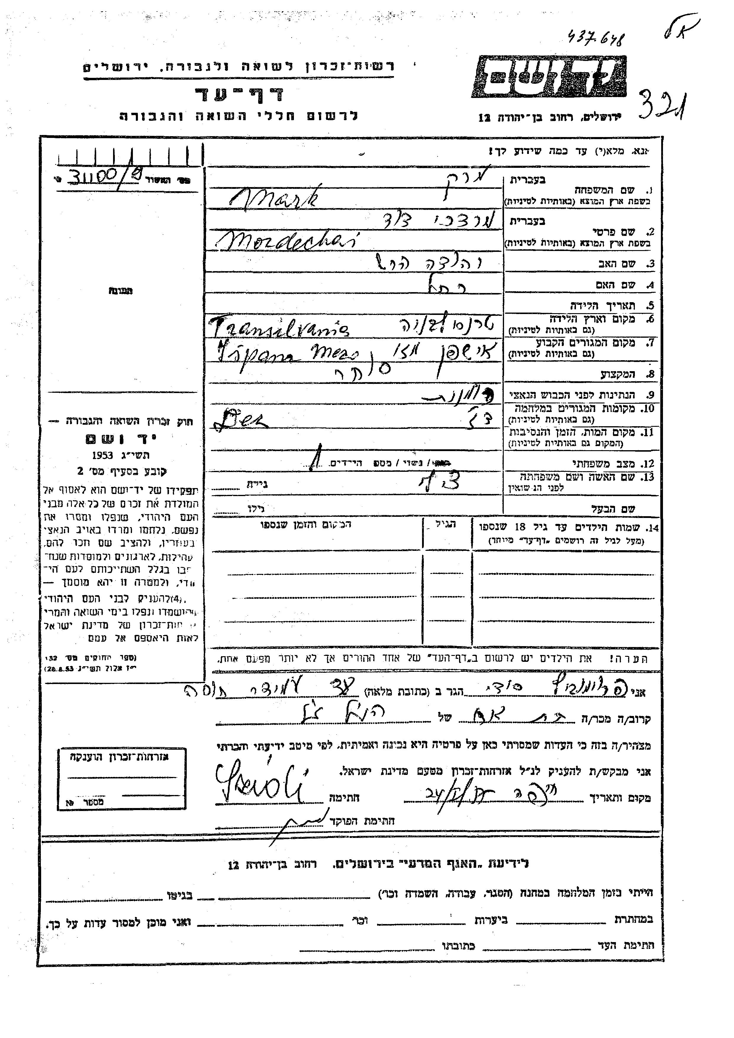 Mordechai David Mark wurde in Transylvania, Rumänien geboren. Er war der Sohn von Yehuda Hersh und Rakhel. Er war Kaufmann/-frau und mit Tzili Verheiratet. Vor dem Zweiten Weltkrieg lebte er in Ispanmezo, Rumänien. Während des Krieges war er in Dej, Rumänien.