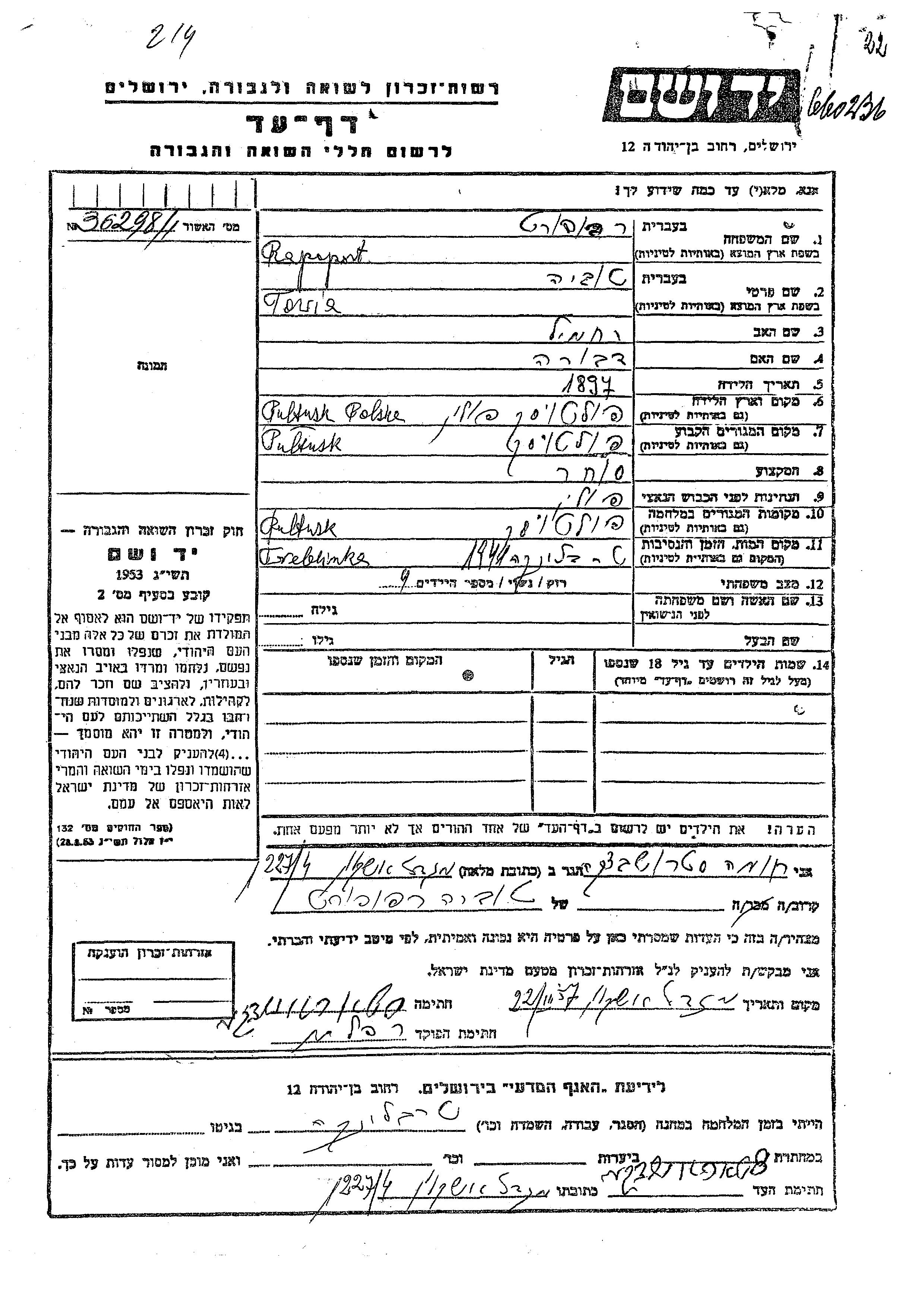 Tovia Rapoport wurde im Jahr 1897 in Pultusk, Polen geboren. Er war der Sohn von Rakhmil und Dvora. Er war Kaufmann/-frau und Verheiratet. Vor dem Zweiten Weltkrieg lebte er in Pultusk, Polen. Während des Krieges war er in Pultusk, Polen.