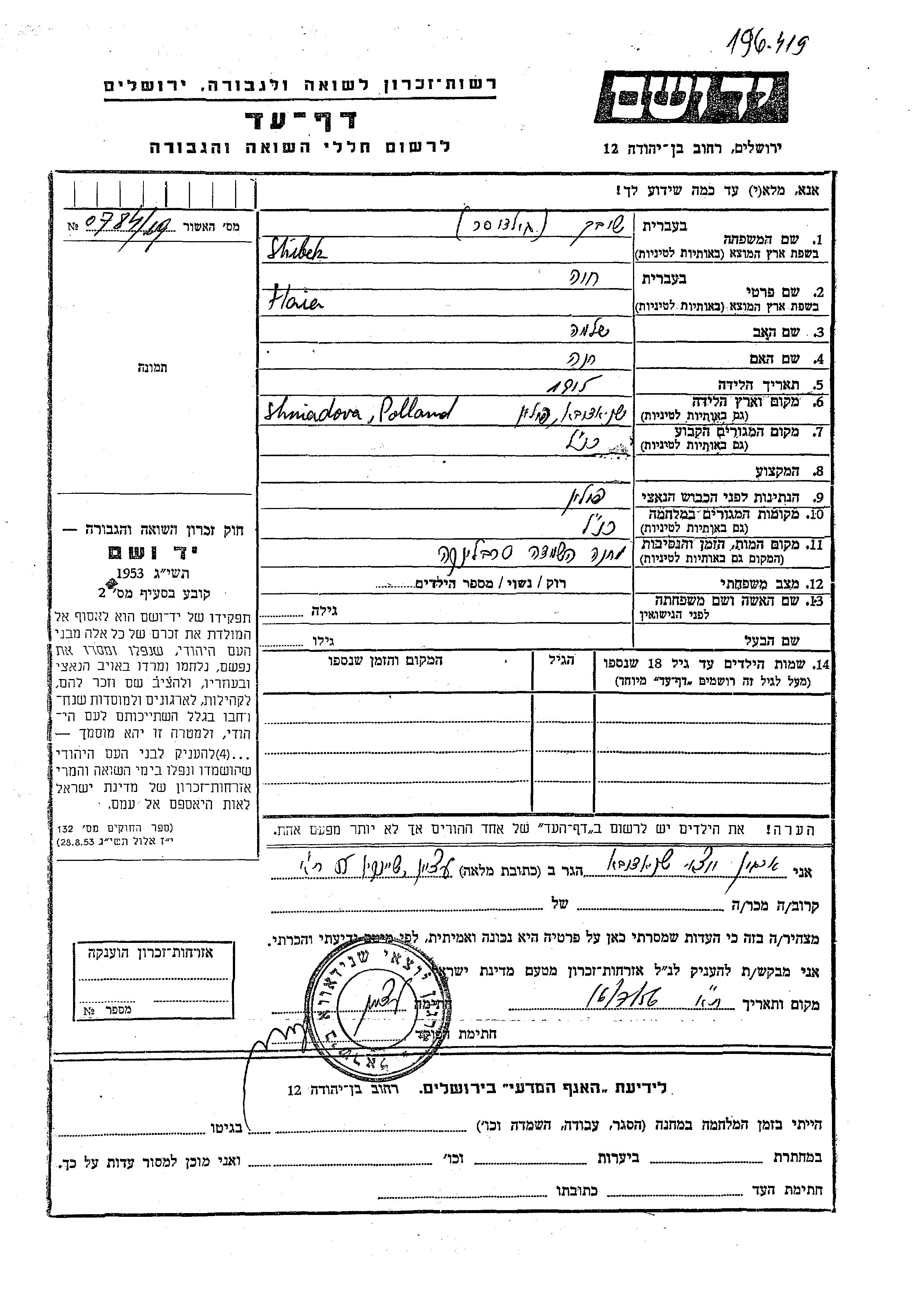 Haia Shibek, geb. Goldvaser wurde im Jahr 1915 in Sniadowo, Polen geboren. Sie war die Tochter von Shlomo und Khana. Vor dem Zweiten Weltkrieg lebte sie in Sniadowo, Polen. Während des Krieges war sie in Sniadowo, Polen.