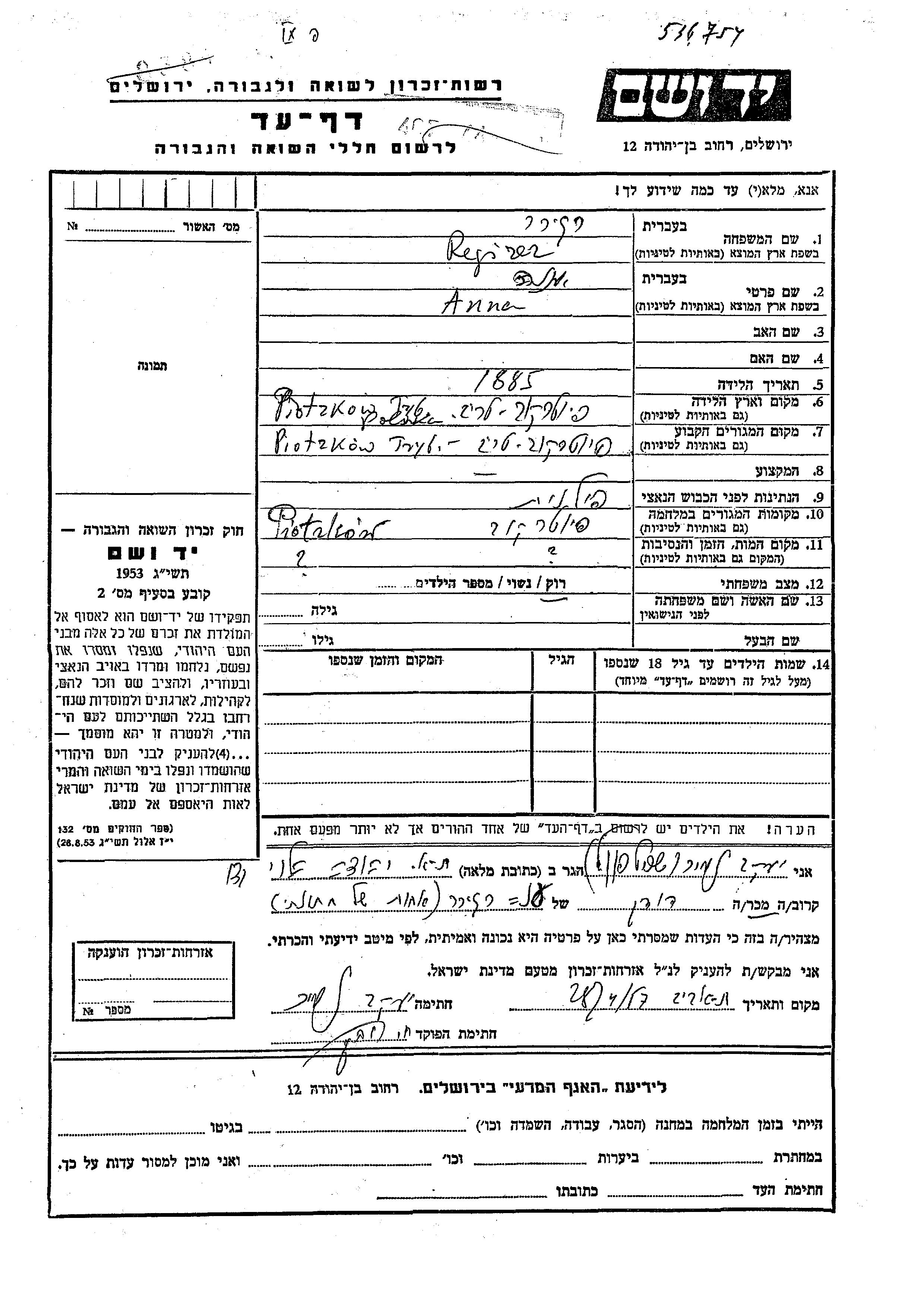 Anna Regirer wurde im Jahr 1885 in Piotrkow Trybunalski, Polen geboren. Sie war Ledig. Vor dem Zweiten Weltkrieg lebte sie in Piotrkow Trybunalski, Polen. Während des Krieges war sie in Piotrkow Trybunalski, Polen.