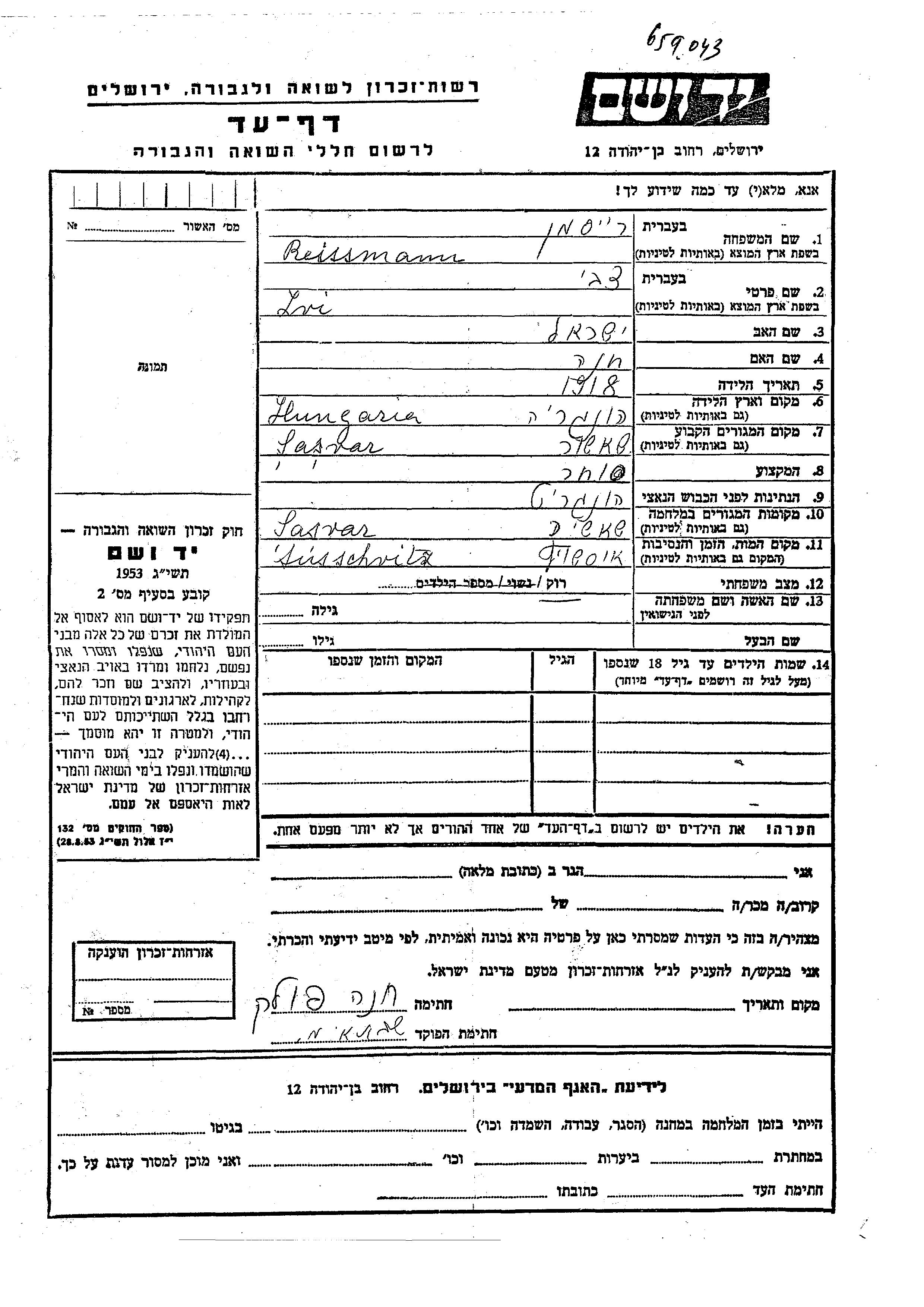Zvi Reissman wurde im Jahr 1918 in Ungarn geboren. Er war der Sohn von Yisrael und Khana. Er war Kaufmann/-frau und Ledig. Vor dem Zweiten Weltkrieg lebte er in Sasvar, Tschechoslowakei. Während des Krieges war er in Sasvar, Tschechoslowakei.