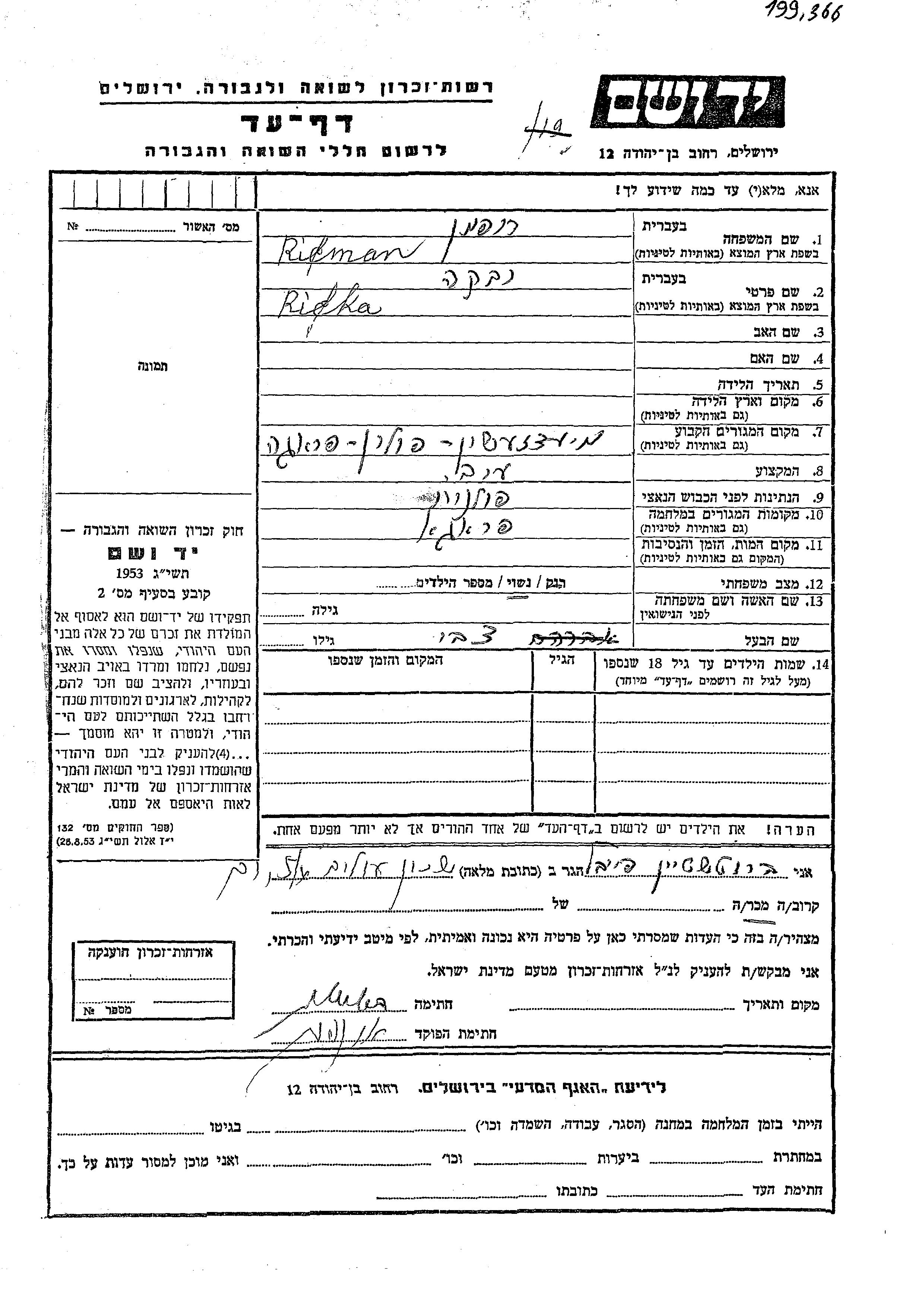 Rivka Rifman Rofman. Sie war Hausfrau und mit Tzvi Verheiratet. Vor dem Zweiten Weltkrieg lebte sie in Miedzeszyn, Polen. Während des Krieges war sie in Praga, Polen.
