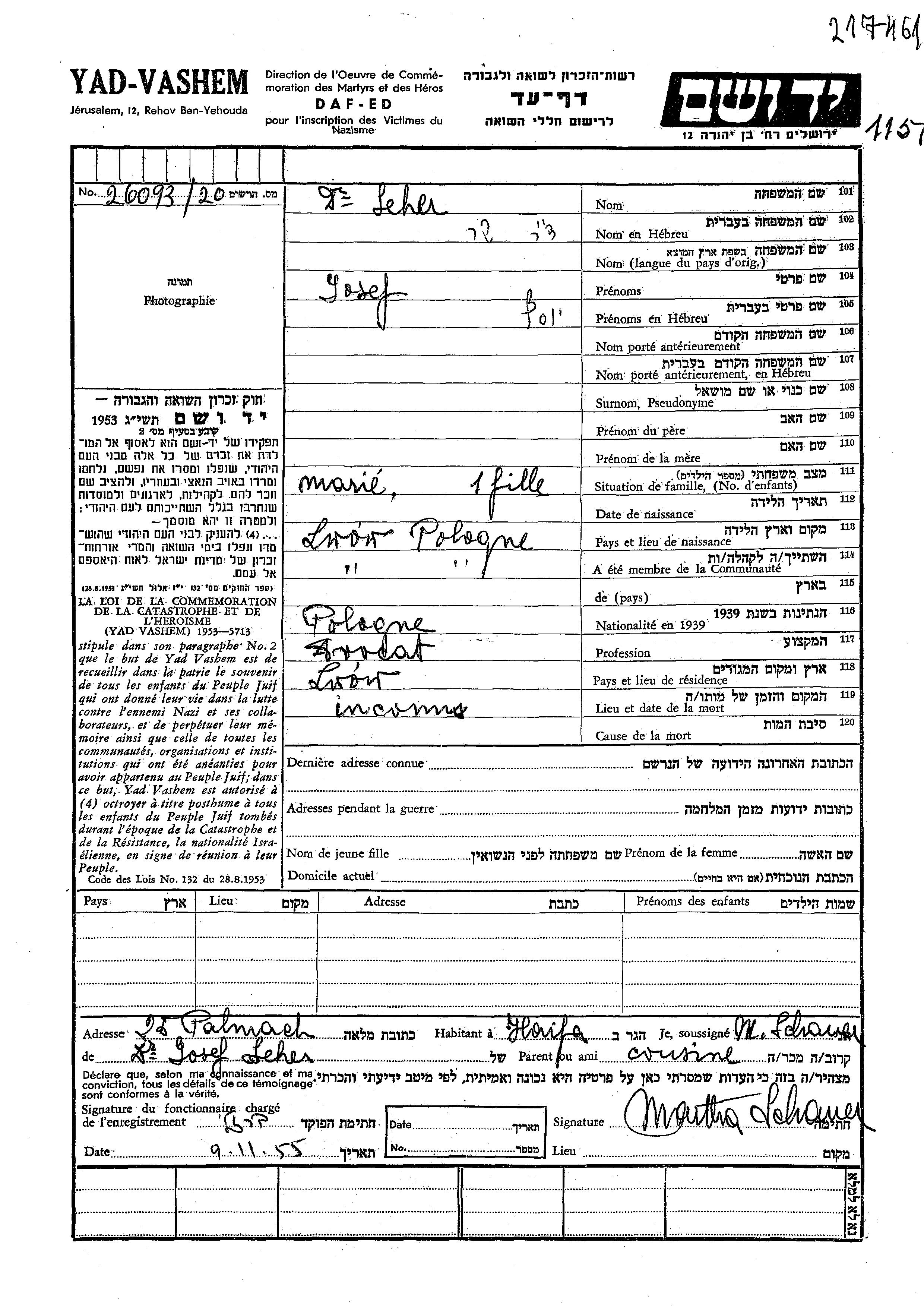 Dr. Yosef Seher Sher wurde in Lwow, Polen geboren. Er war Rechtsanwalt/rechtsanwältin. Vor dem Zweiten Weltkrieg lebte er in Lwow, Polen.