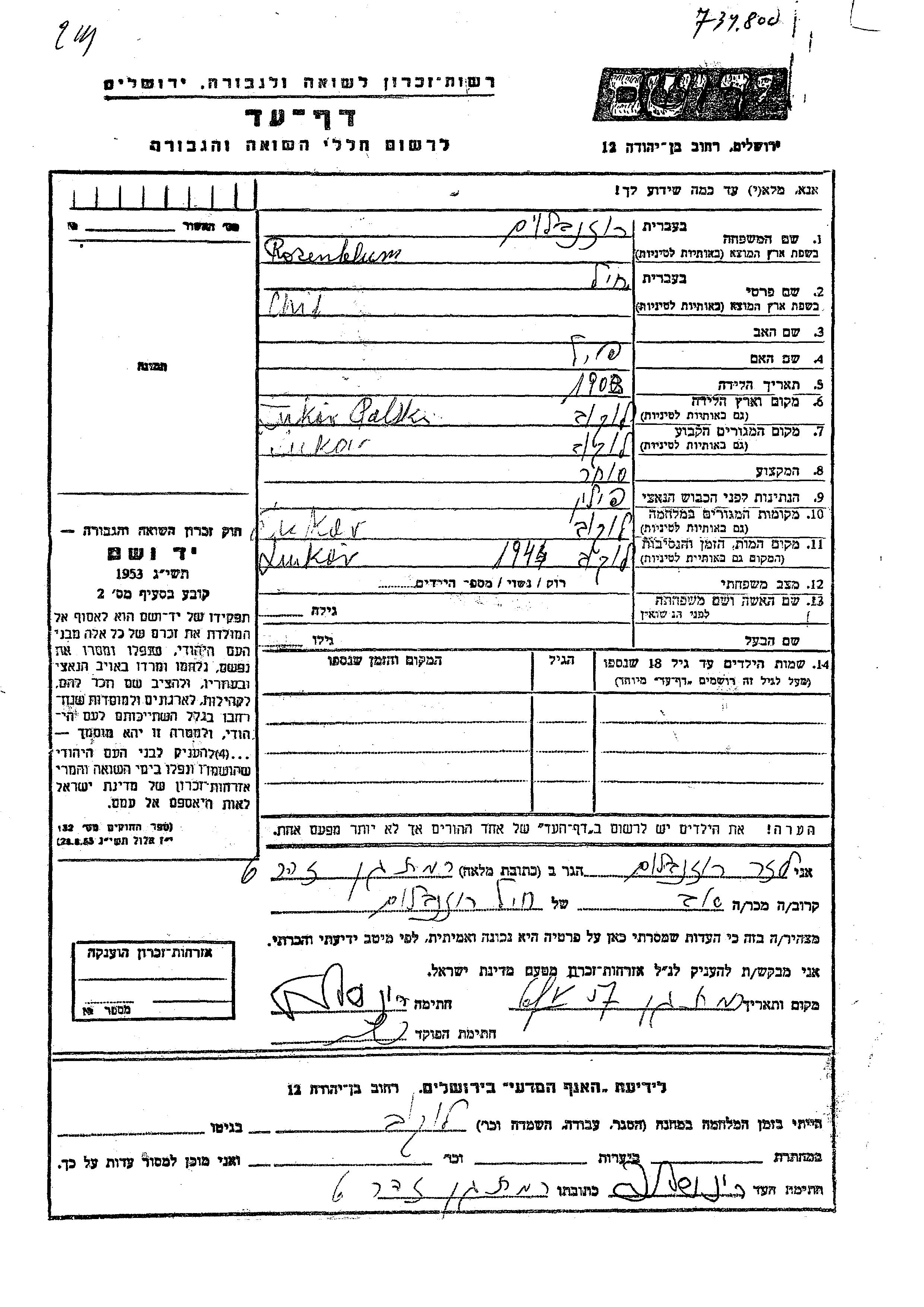 Chil Rozenblum wurde im Jahr 1903 in Lukow, Polen geboren. Er war der Sohn von Pol. Er war Kaufmann/-frau. Vor dem Zweiten Weltkrieg lebte er in Lukow, Polen. Während des Krieges war er in Lukow, Polen.