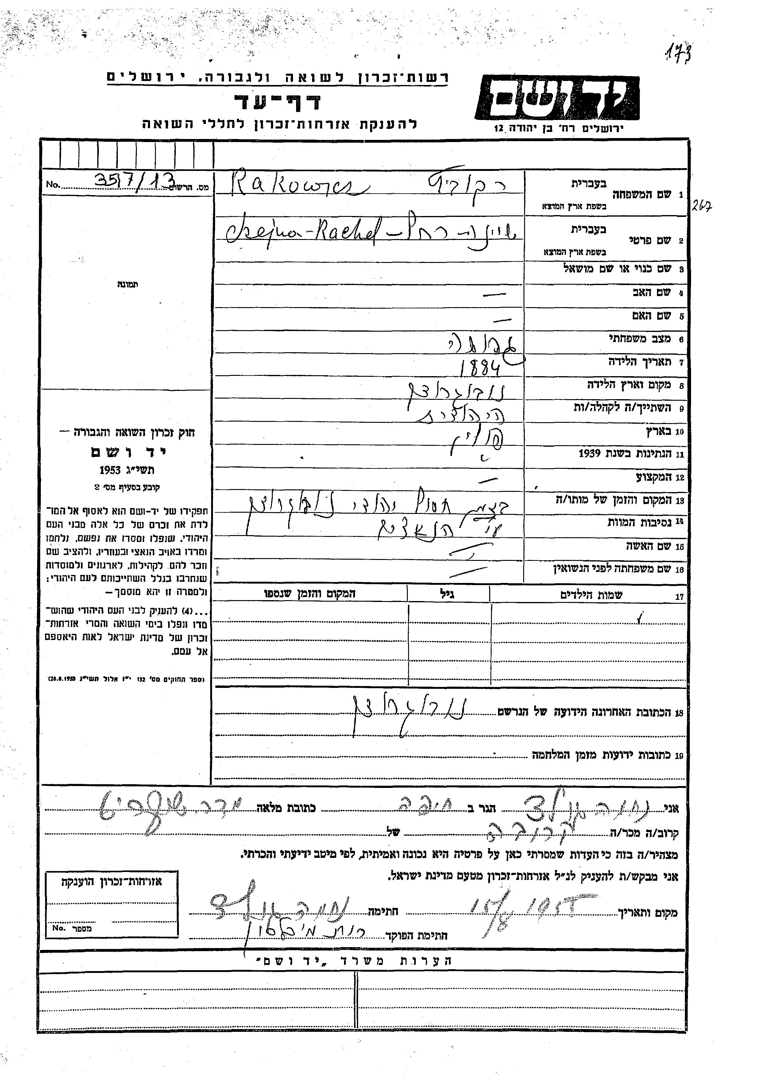Szejna Rachel Rakowicz wurde im Jahr 1884 in Nowogrodek, Polen geboren. Sie war Geschieden. Während des Krieges war sie in Nowogrodek, Polen.