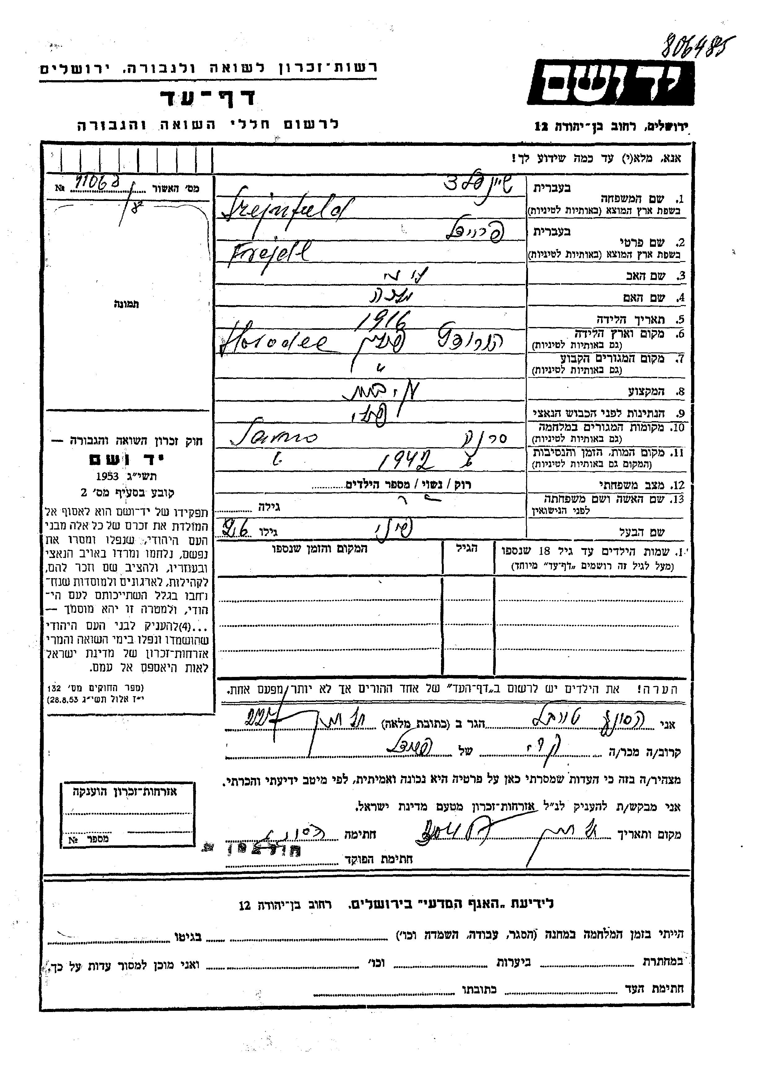 Frejdl Szejnfeld wurde im Jahr 1916 in Horodec, Polen geboren. Sie war die Tochter von Malka. Sie war Hausfrau und mit Pini Verheiratet. Vor dem Zweiten Weltkrieg lebte sie in Horodec, Polen. Während des Krieges war sie in Sarno, Polen.