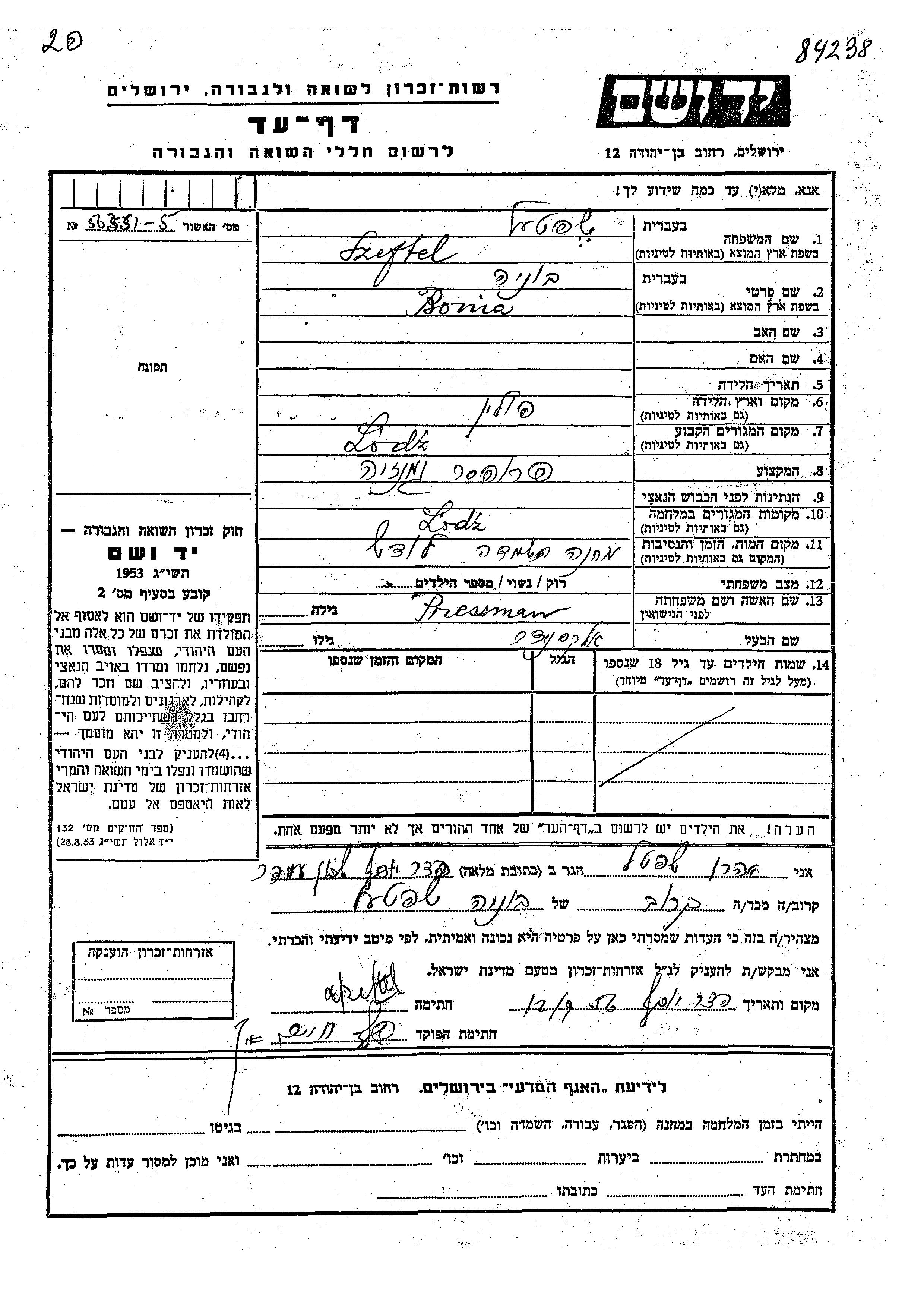Bonia Szeftel, geb. Pressman wurde in Polen geboren. Sie war Gymnasiallehrer/-in und mit Aleksander Verheiratet. Vor dem Zweiten Weltkrieg lebte sie in Lodz, Polen. Während des Krieges war sie in Lodz, Polen.