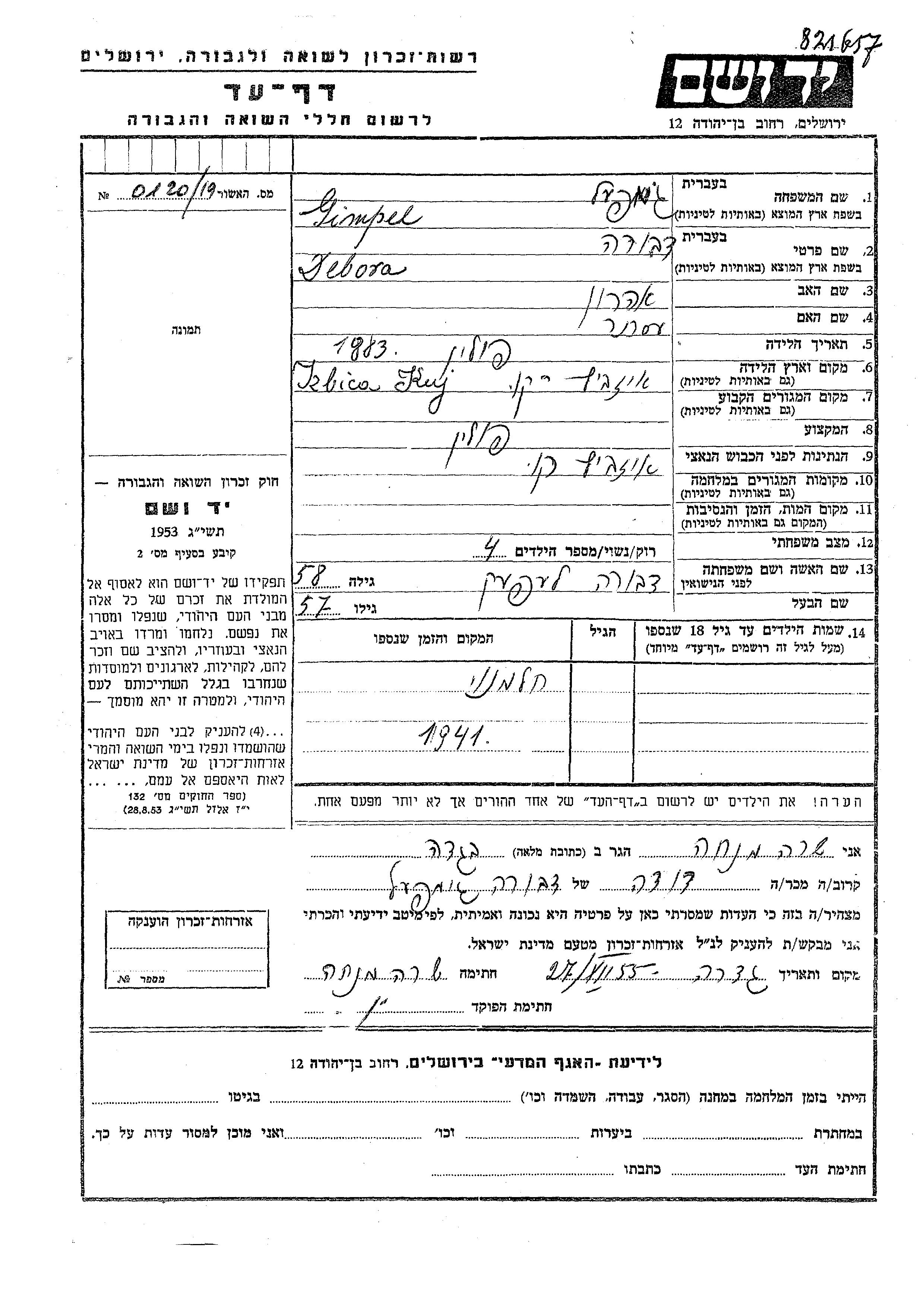 Debora Gempel, geb. Lepek wurde im Jahr 1883 in Izbica Kujawska, Polen geboren. Sie war die Tochter von Aharon und Ester. Sie war Verheiratet. Vor dem Zweiten Weltkrieg lebte sie in Izbica Kujawska, Polen. Während des Krieges war sie in Izbica Kujawska, Polen.