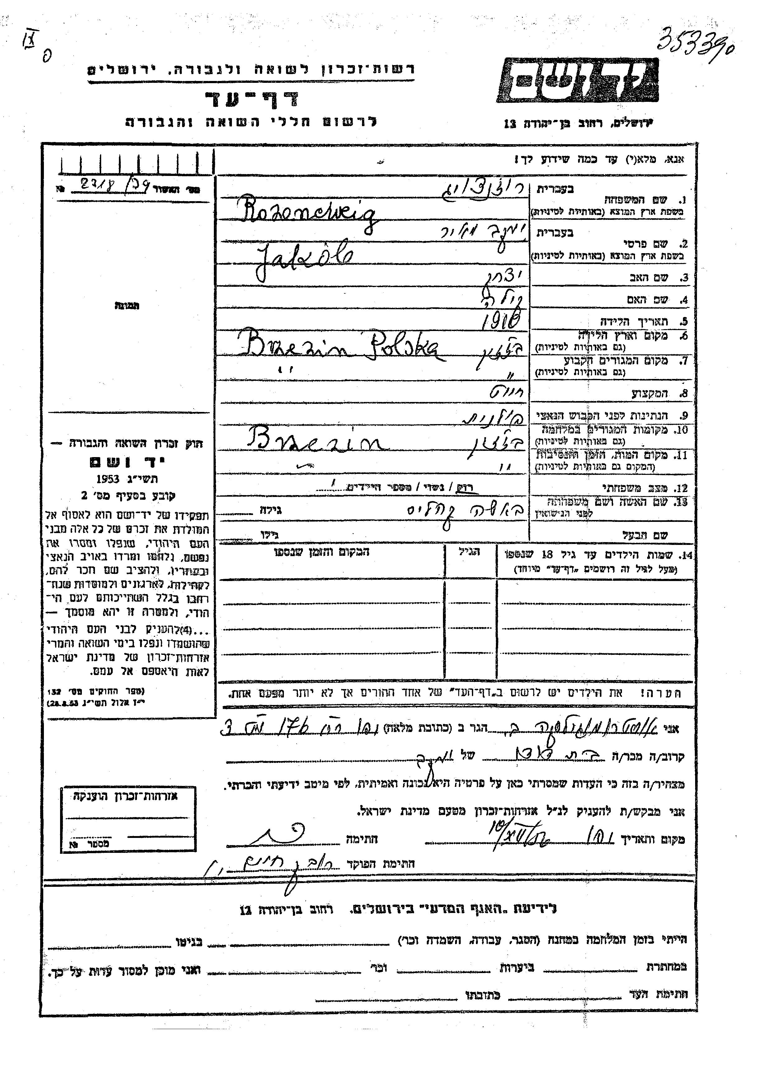 Jakob Meir Rozencweig wurde im Jahr 1910 in Brzezin, Polen geboren. Er war der Sohn von Yitzkhak und Keila. Er war Schneider und Ledig. Vor dem Zweiten Weltkrieg lebte er in Brzezin, Polen. Während des Krieges war er in Brzezin, Polen.