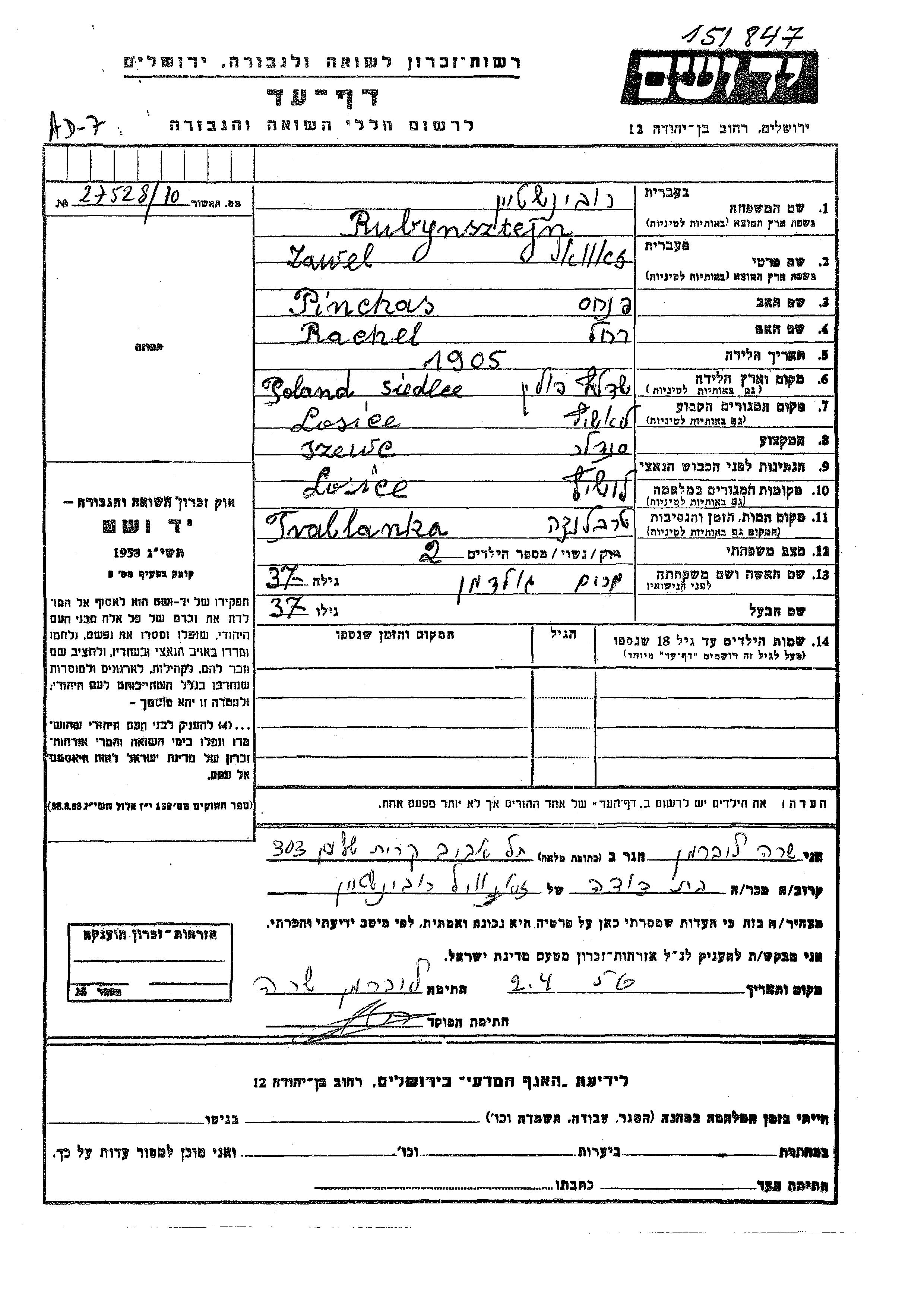 Zawel Rubynsztejn wurde im Jahr 1905 in Siedlce, Polen geboren. Er war der Sohn von Pinchas und Rachel. Er war Schuster/-in und mit Miriam, geb. Goldman Verheiratet. Vor dem Zweiten Weltkrieg lebte er in Losice, Polen. Während des Krieges war er in Losice, Polen.