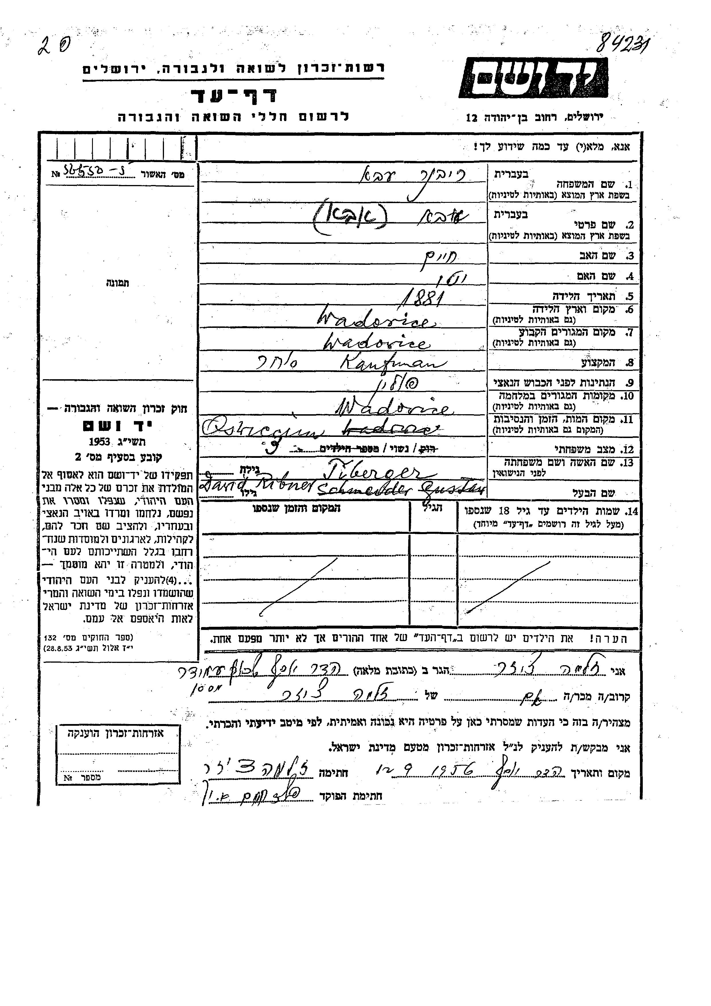 Aba Ribner wurde im Jahr 1881 in Wadowice, Polen geboren. Er war der Sohn von Khaim und Etu. Er war Kaufmann/-frau und mit David, geb. Tiberger Verheiratet. Vor dem Zweiten Weltkrieg lebte er in Wadowice, Polen. Während des Krieges war er in Wadowice, Polen.