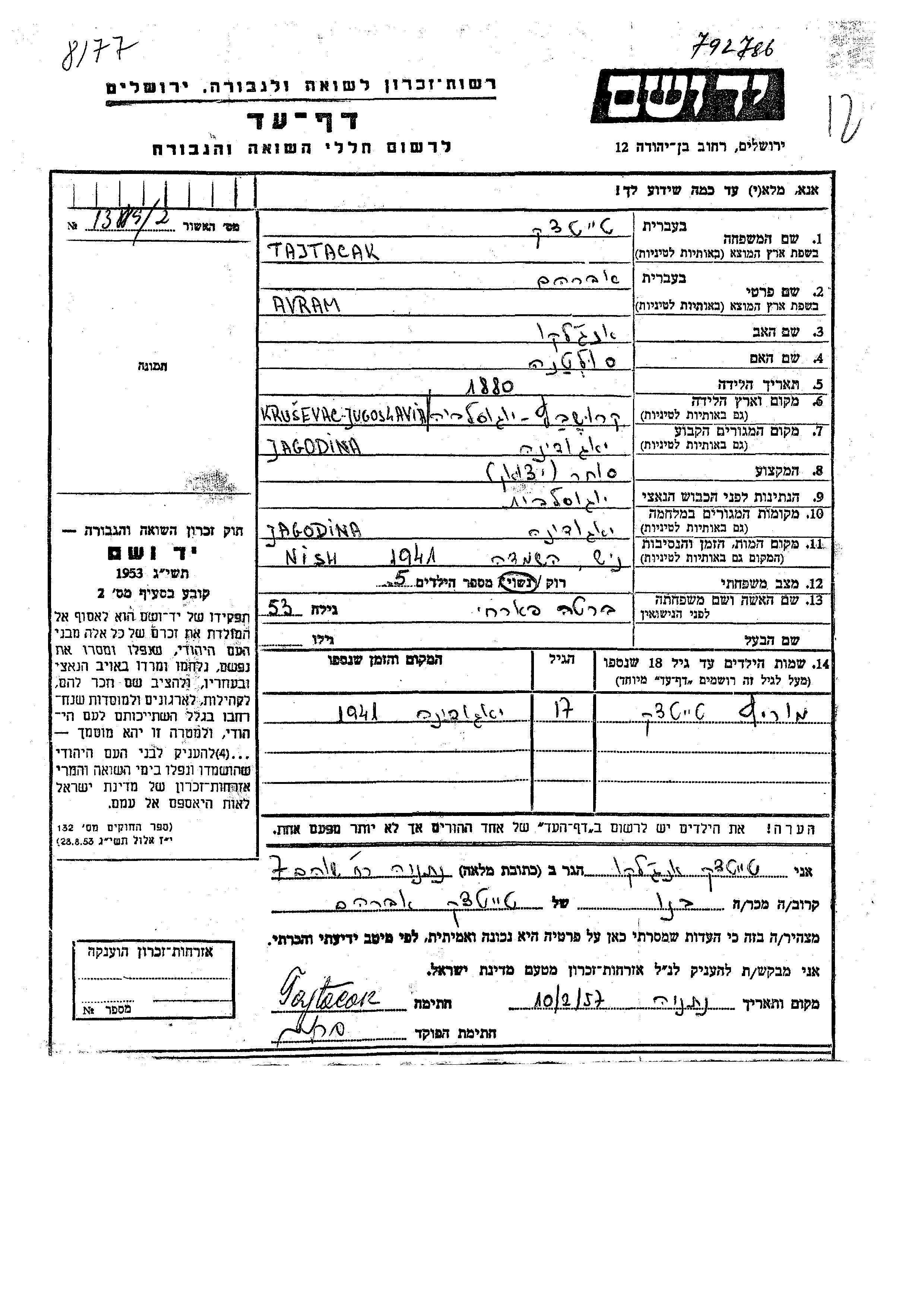 Avram Tajtacak wurde im Jahr 1880 in Krusevac, Jugoslawien geboren. Er war der Sohn von Engel und Sultana. Er war Kaufmann/-frau und mit Berta, geb. Farkhi Verheiratet. Vor dem Zweiten Weltkrieg lebte er in Jagodina, Jugoslawien. Während des Krieges war er in Dorochoi, Rumänien.