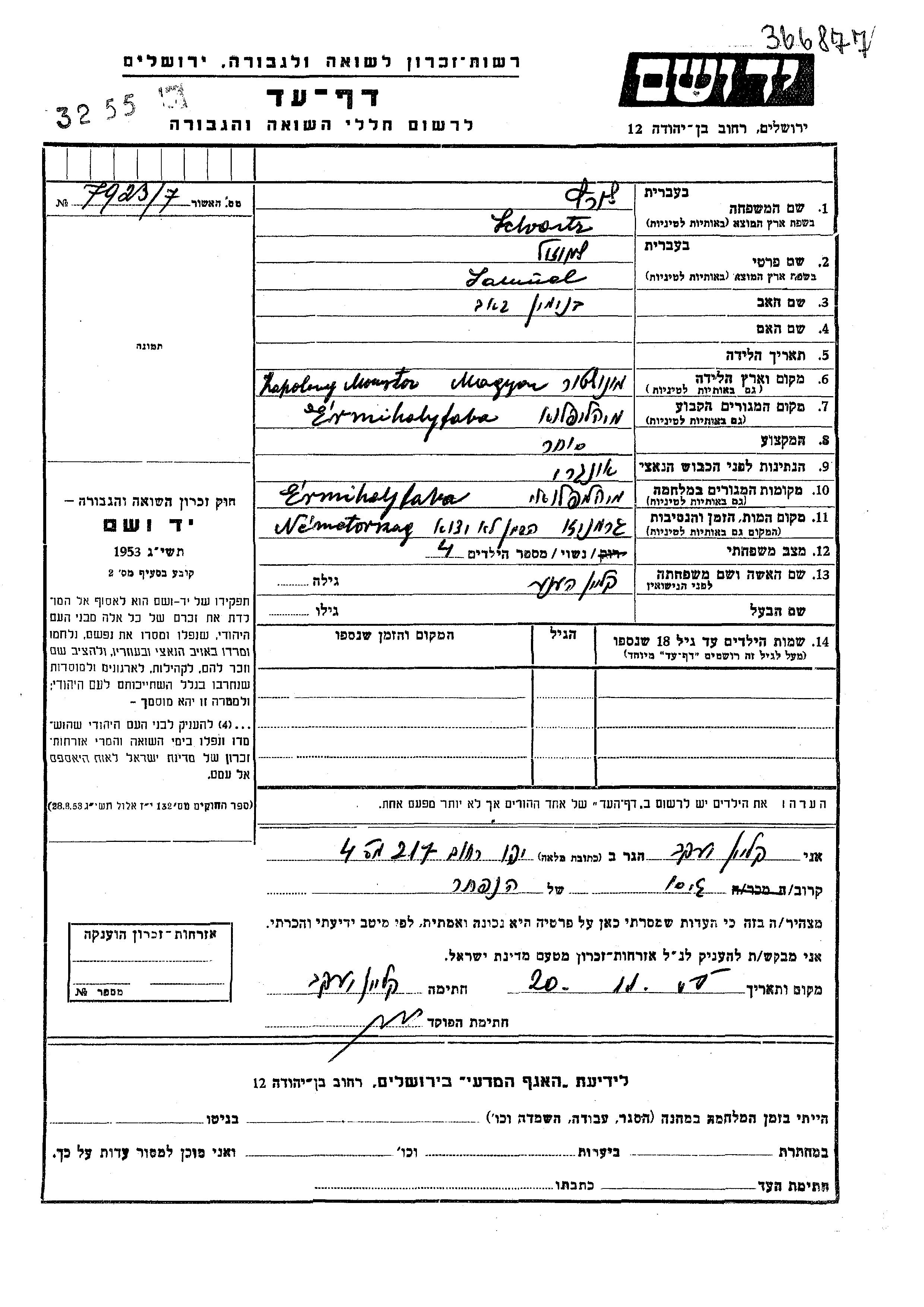 Shmuel Schwartz wurde in Monostor, Rumänien geboren. Er war der Sohn von Beniamin Zeev. Er war Kaufmann/-frau und mit Hene, geb. Klein Verheiratet. Vor dem Zweiten Weltkrieg lebte er in Ermihajfalva, Rumänien. Während des Krieges war er in Ermihajfalva, Rumänien.