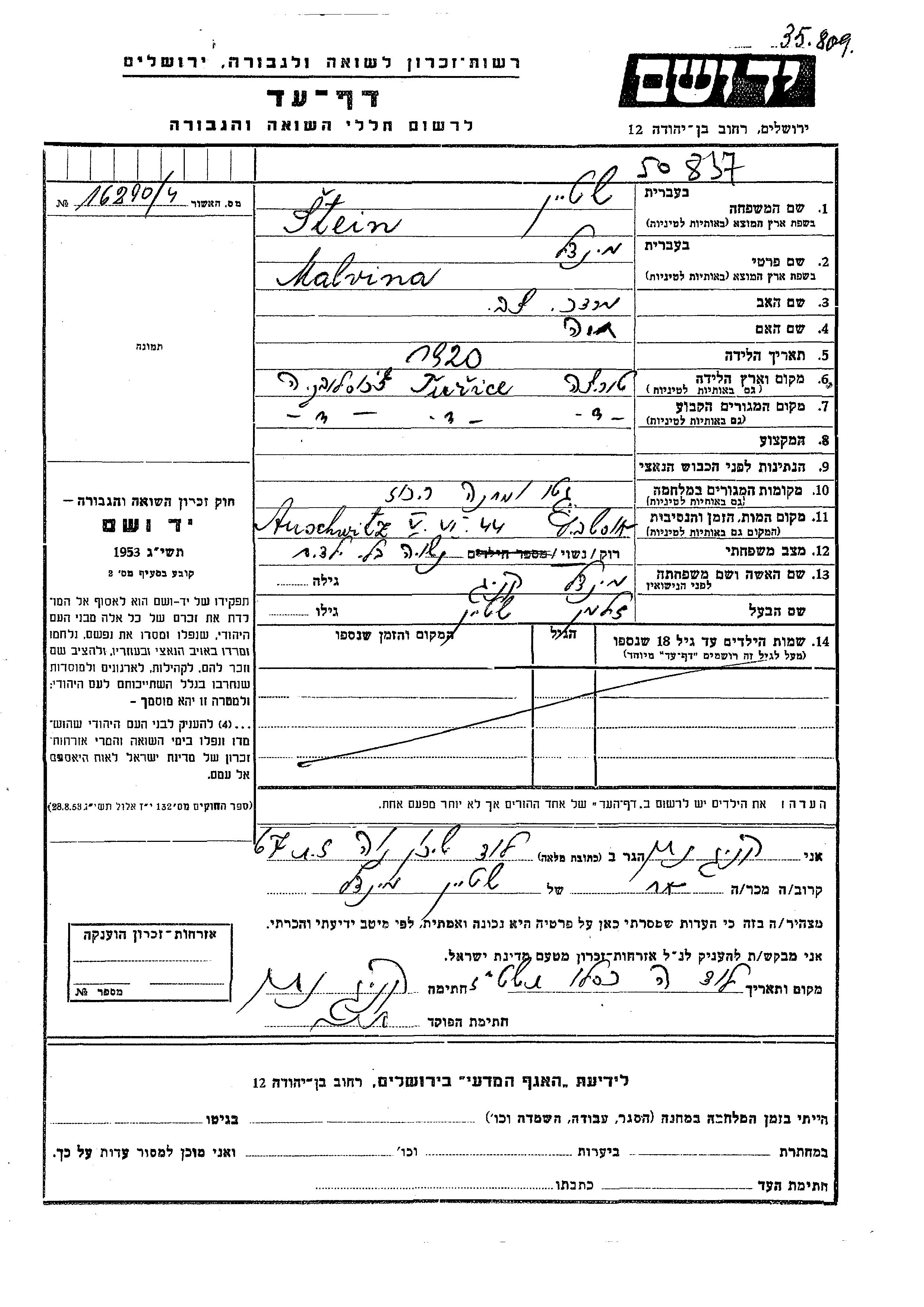 Mindl Malvina Stein, geb. Kenig wurde im Jahr 1920 in Turice, Tschechoslowakei geboren. Sie war die Tochter von Mordekhai Tzvi und Khaia. Sie war mit Zalman Verheiratet. Vor dem Zweiten Weltkrieg lebte sie in Turice, Tschechoslowakei.