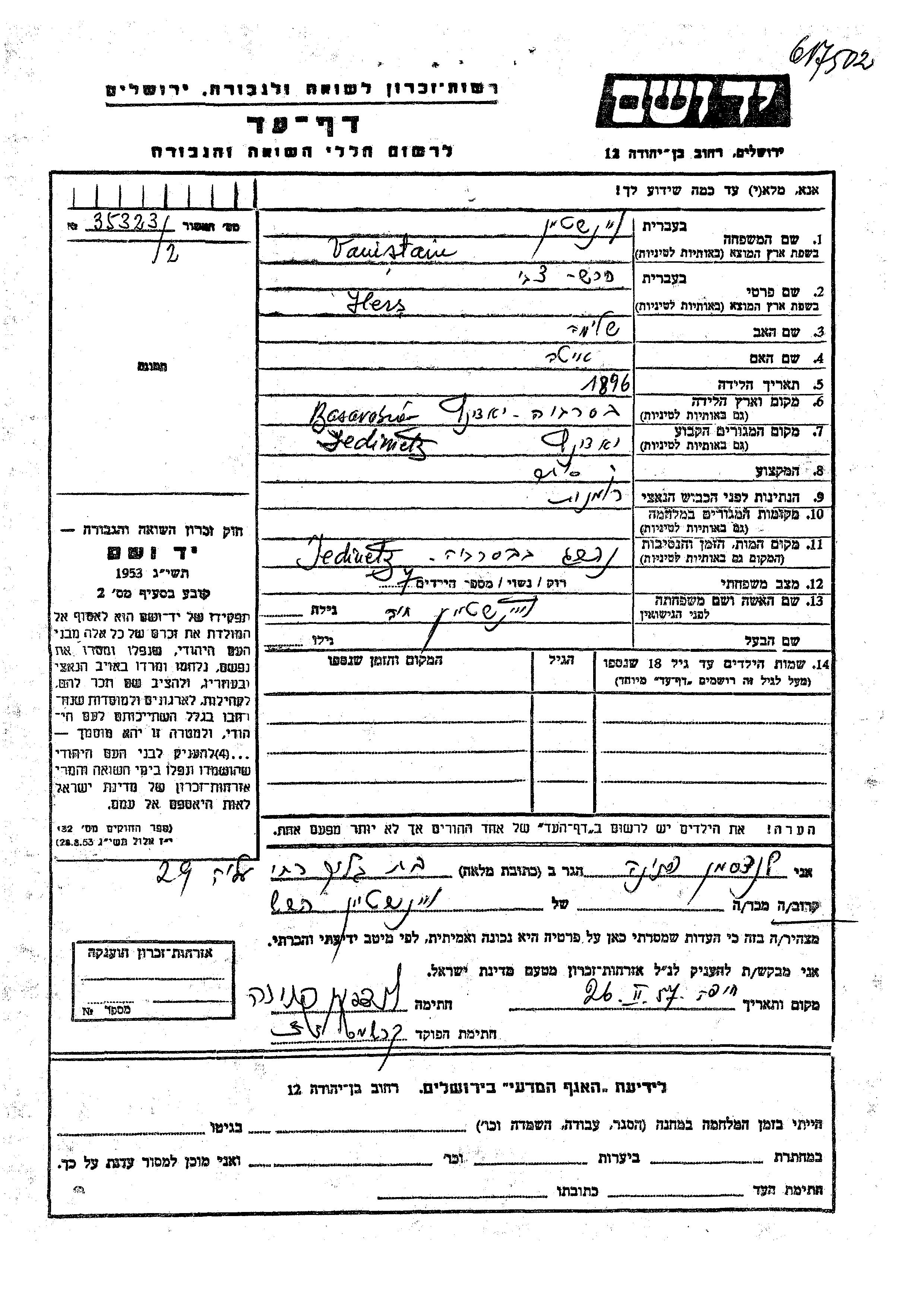 Hers Tzvi wurde in der Schoah ermordet. Todesort: Jediniz, Rumänien.