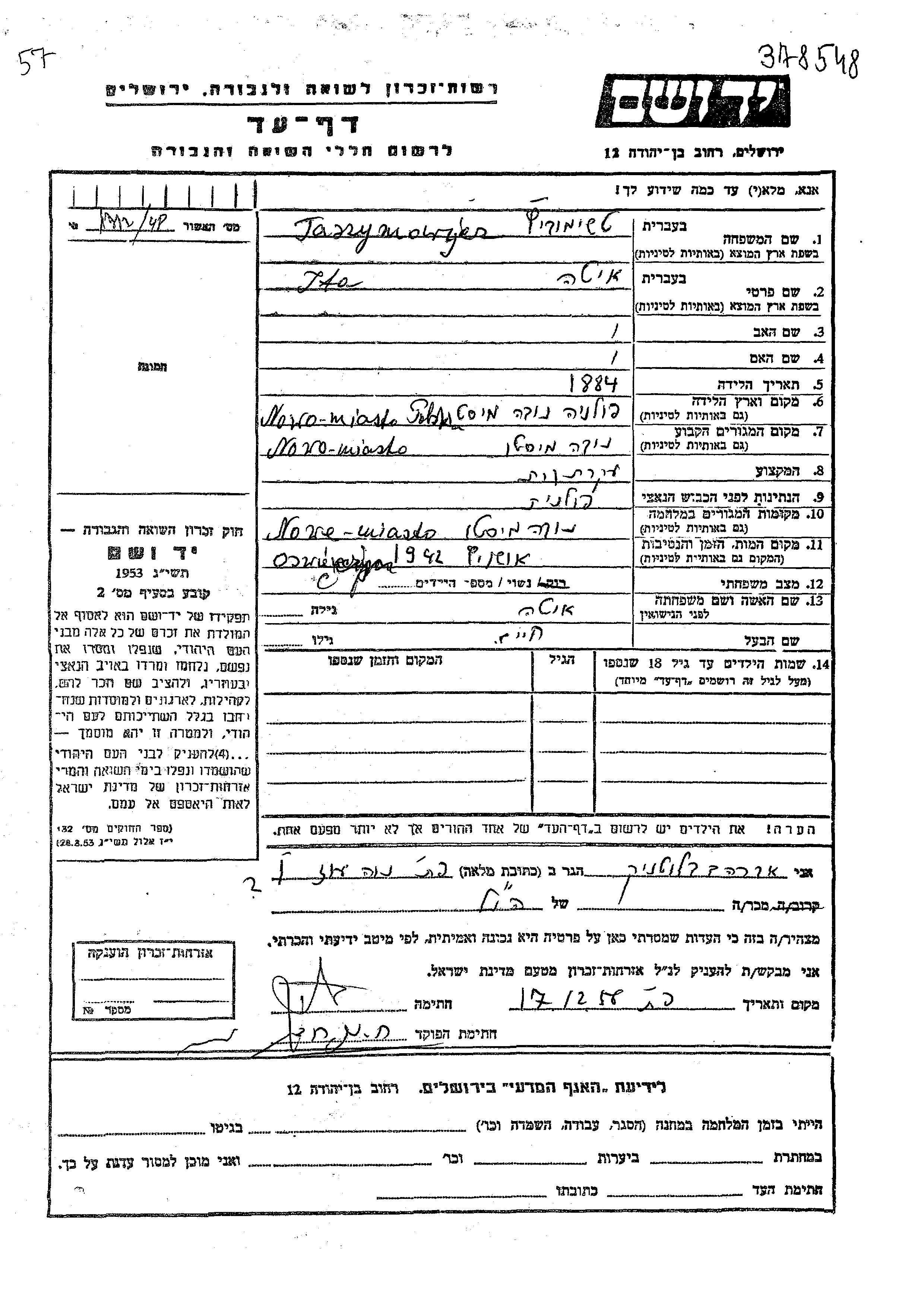 Taszymowicz Ita 1884 Nowo Miasto, Polen Gedenkblatt