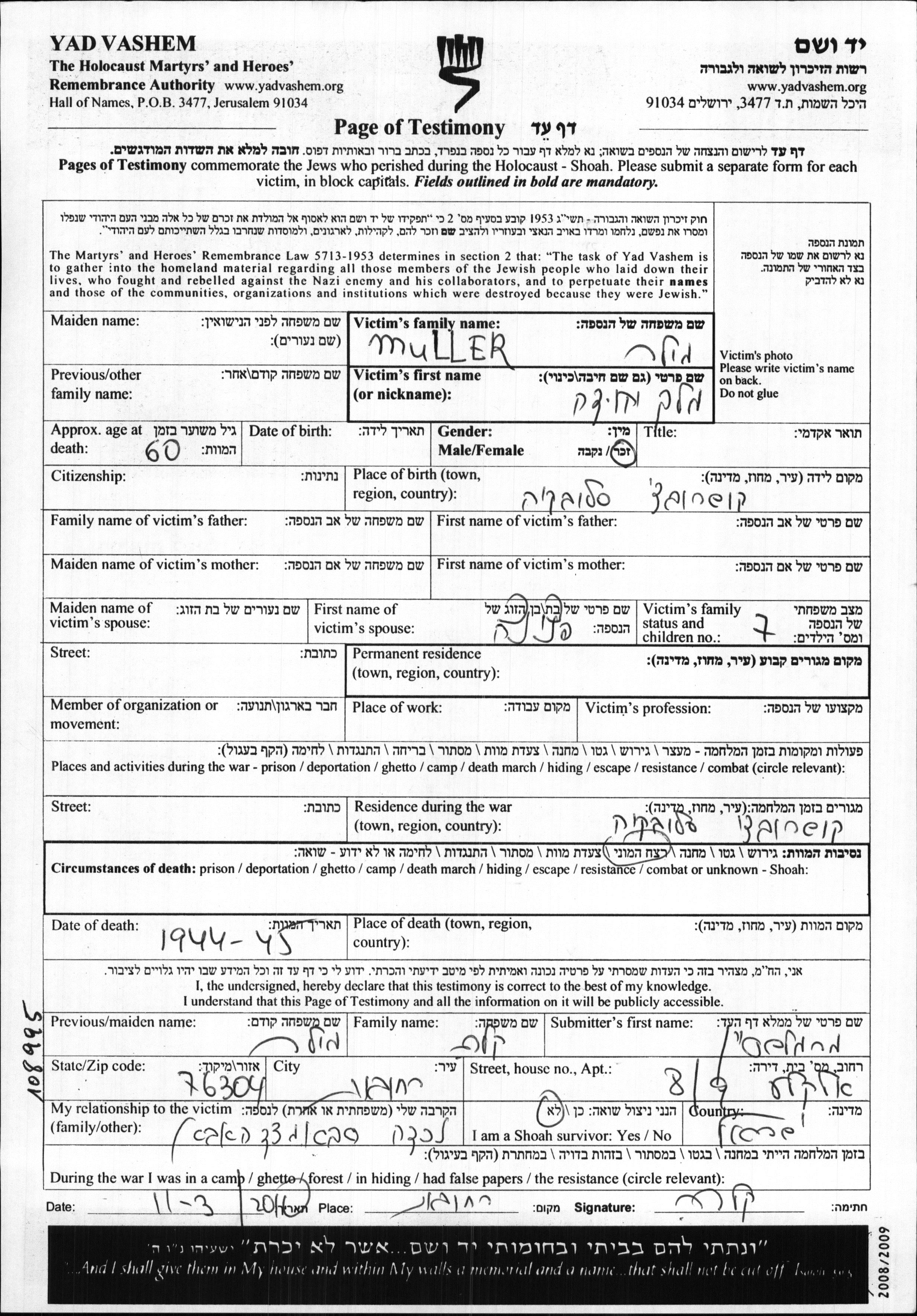 Melekh Yehuda Muler wurde in Kosarovce, Tschechoslowakei geboren. Er war mit Pnina Verheiratet. Vor dem Zweiten Weltkrieg lebte er in Kosarovce, Tschechoslowakei. Während des Krieges war er in Kosarovce, Tschechoslowakei.