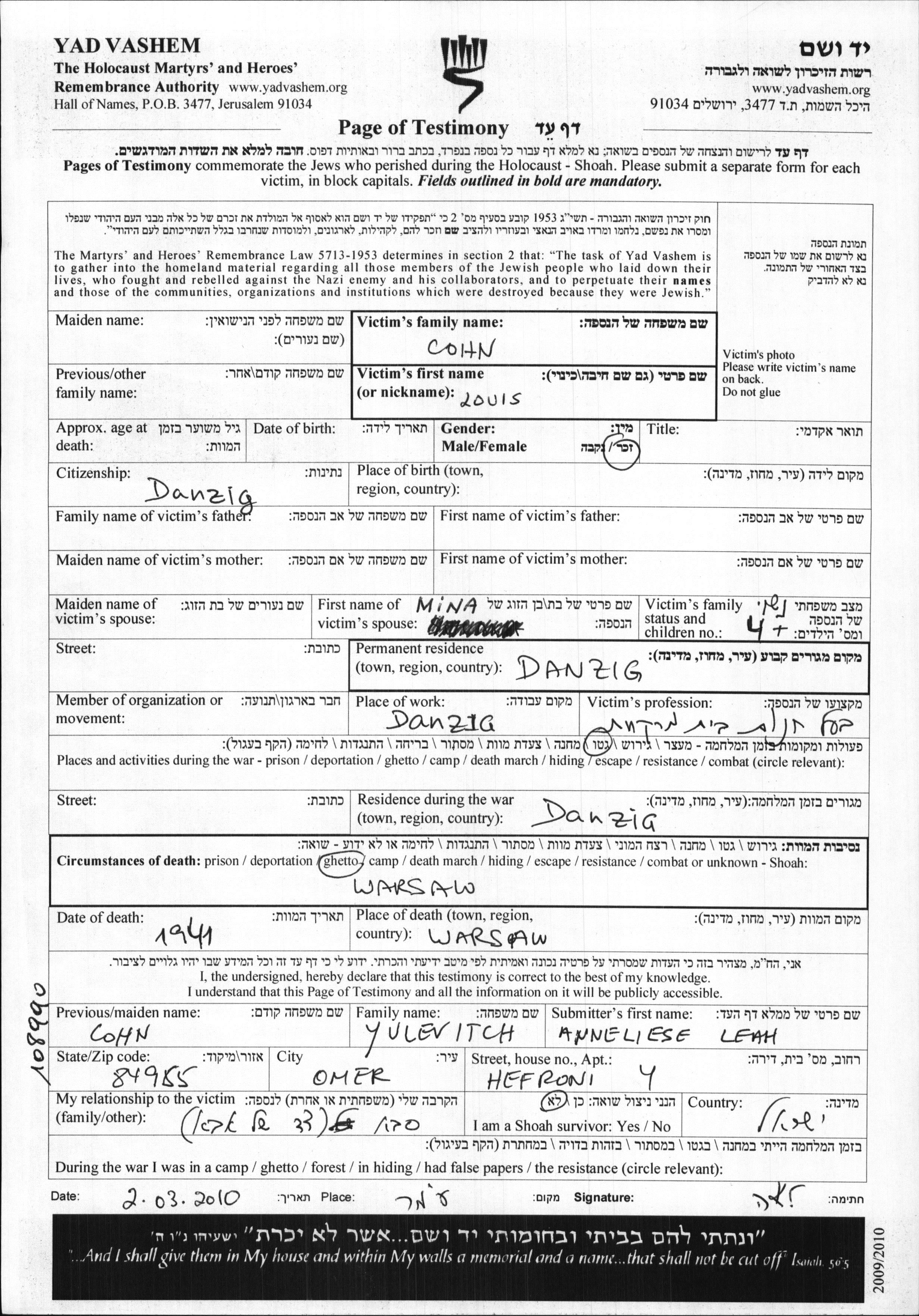 Louis wurde in der Schoah ermordet. Todesort: Warszawa, Polen im Jahr 1941.