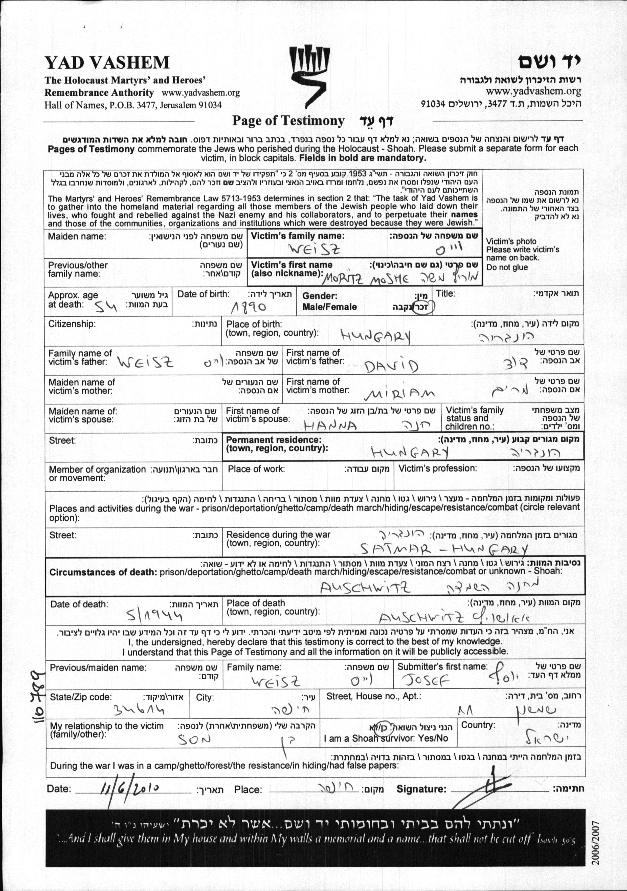 Moritz Moshe Veis wurde im Jahr 1890 in Ungarn geboren. Er war der Sohn von David und Miriam. Er war mit Chana Verheiratet. Vor dem Zweiten Weltkrieg lebte er in Ungarn. Während des Krieges war er in Satmar, Rumänien.