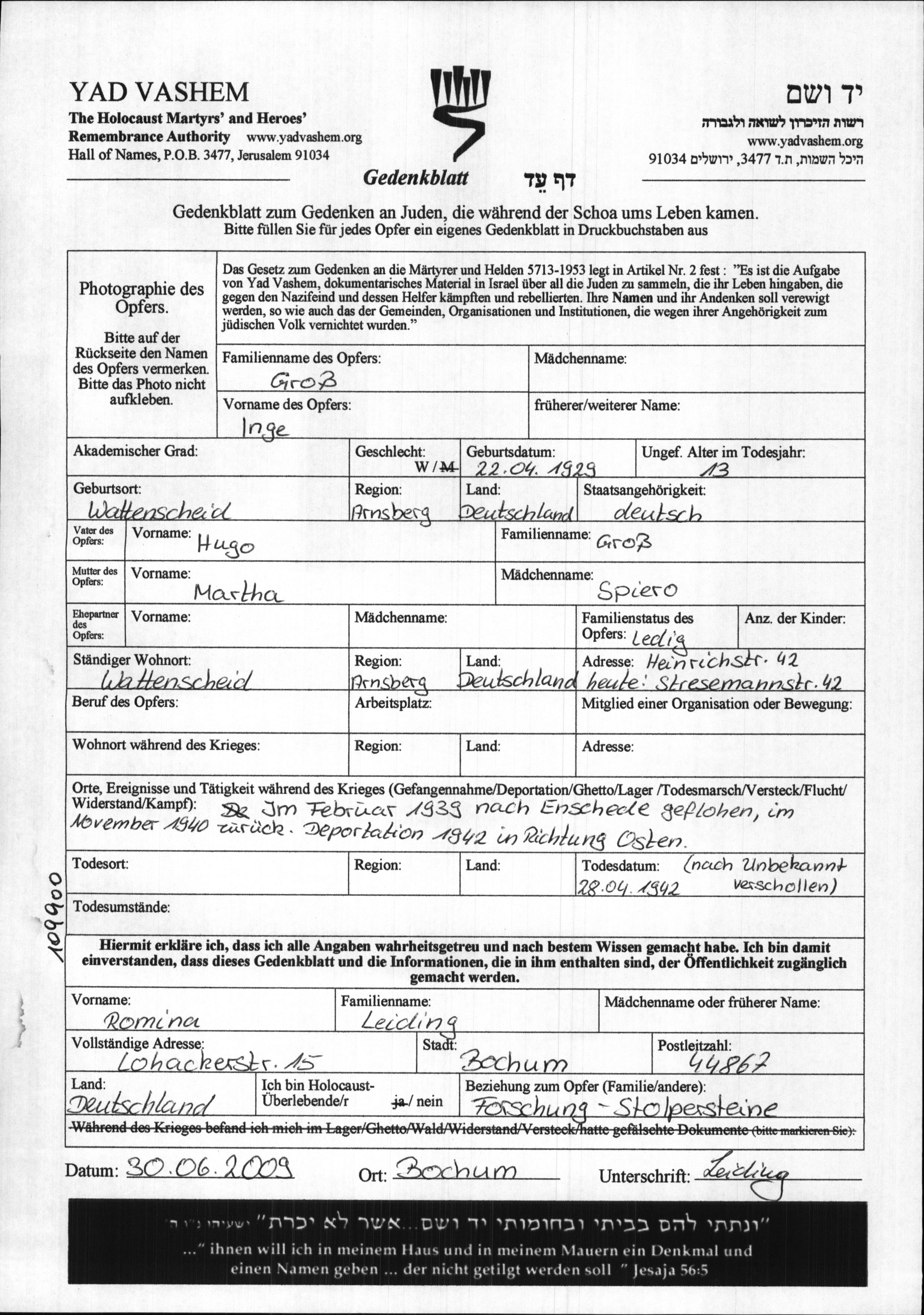 Inge wurde in der Schoah ermordet. Todesort: unbekannt im Jahr 28/04/1942.