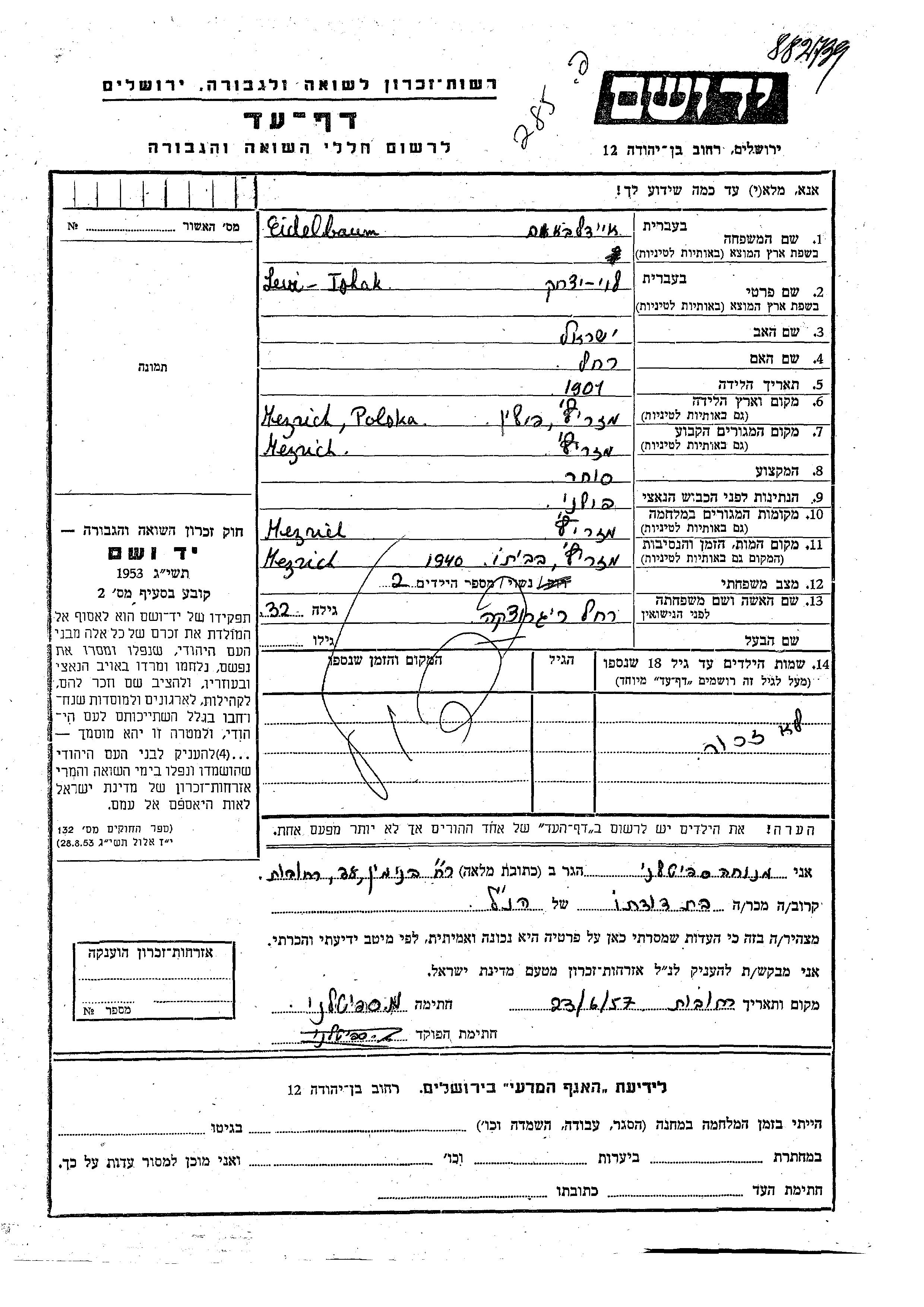 Yitzkhak Levi wurde in der Schoah ermordet. Todesort: Mezrich, Polen im Jahr 1940.