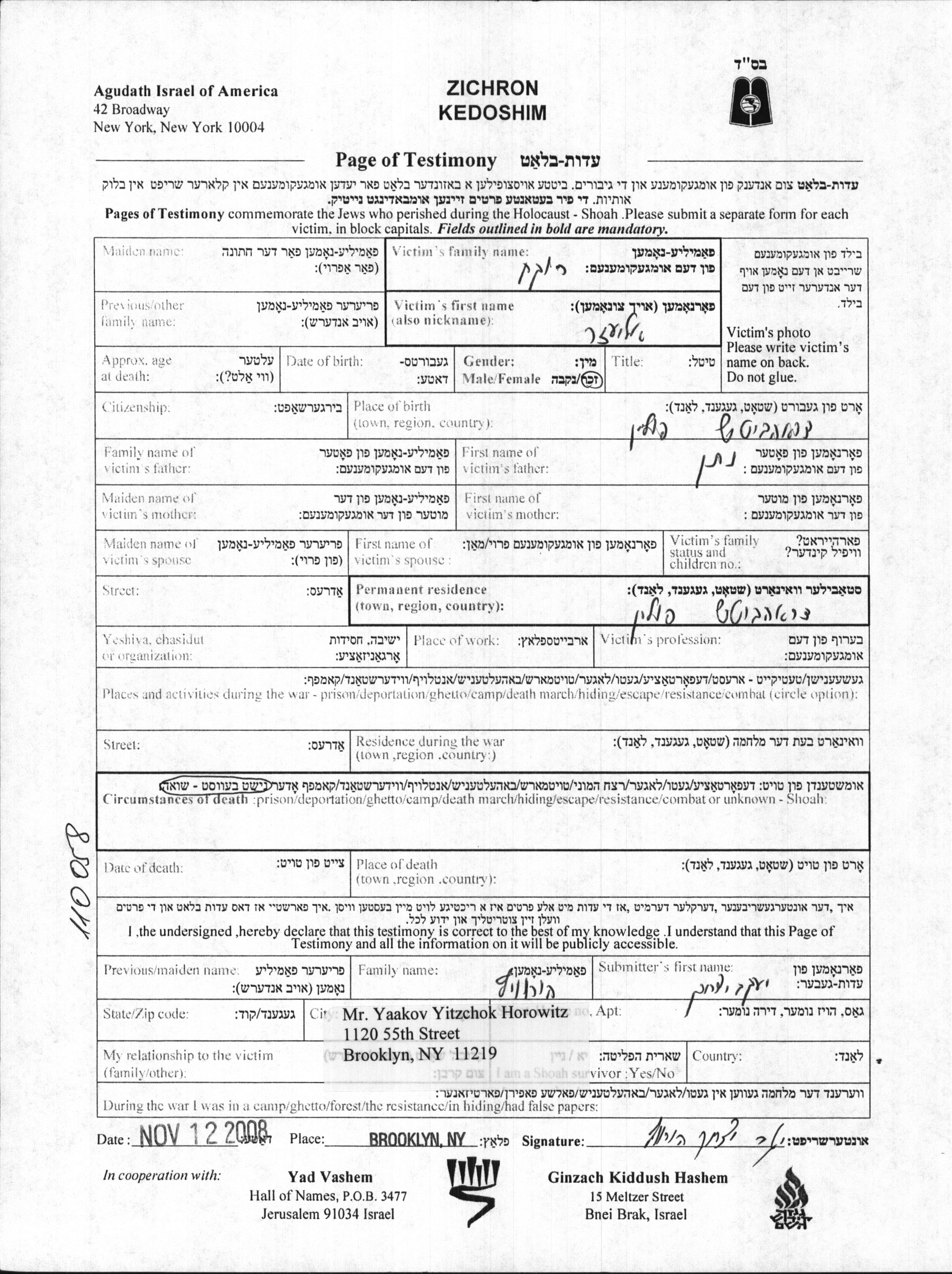 Eliezer wurde in der Schoah ermordet.