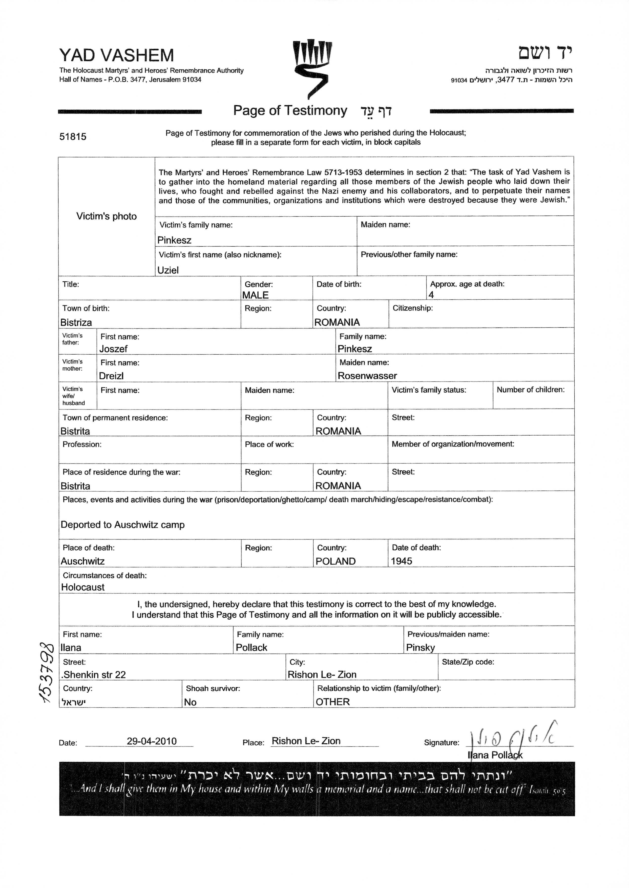 Pinkesz Uziel Bistrita, Rumänien Gedenkblatt (digital)