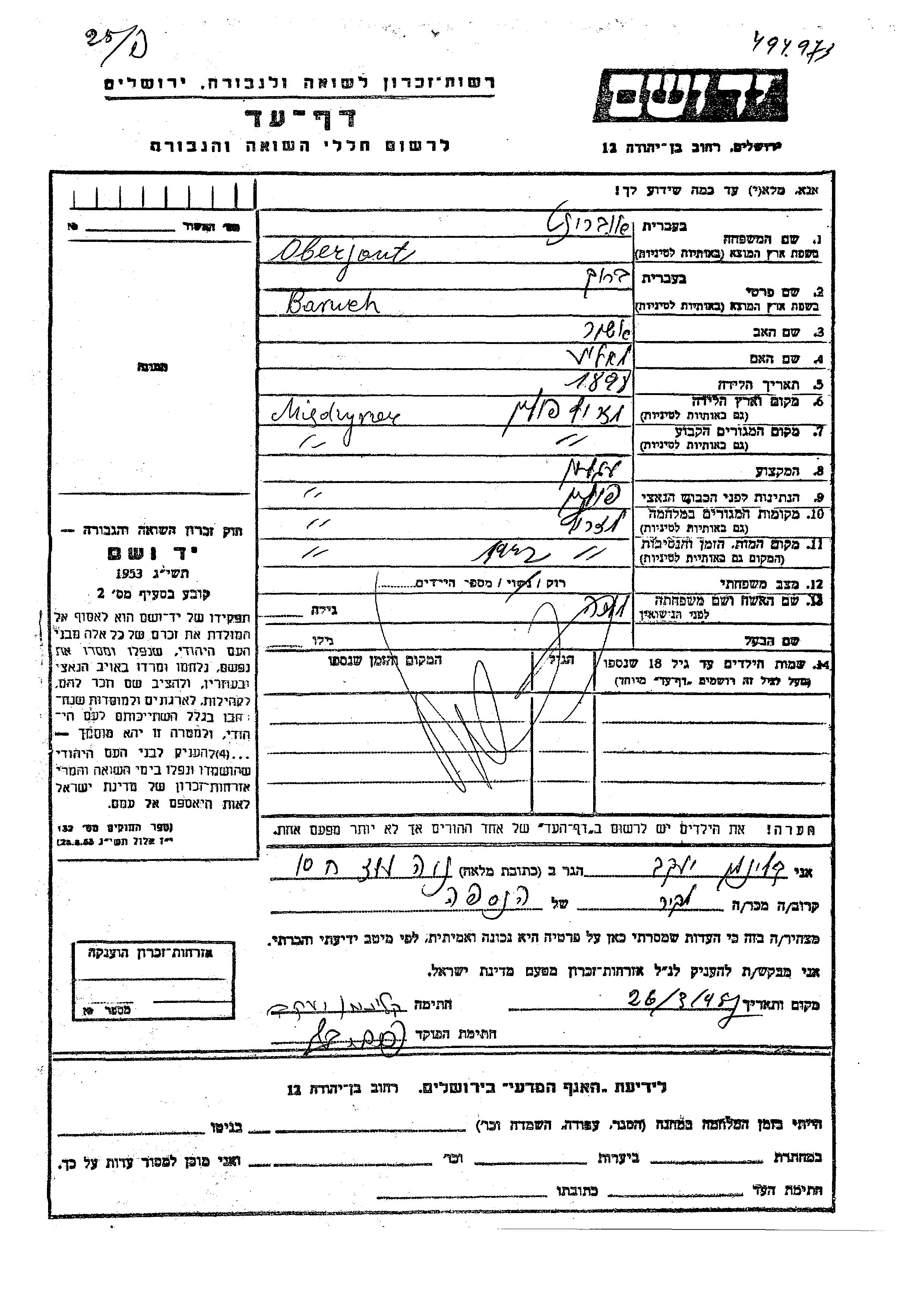 Baruch Oberjant wurde im Jahr 1898 in Meserics, Polen geboren. Er war der Sohn von Asher und Malka. Er war Fuhrmann. Vor dem Zweiten Weltkrieg lebte er in Meserics, Polen. Während des Krieges war er in Meserics, Polen.
