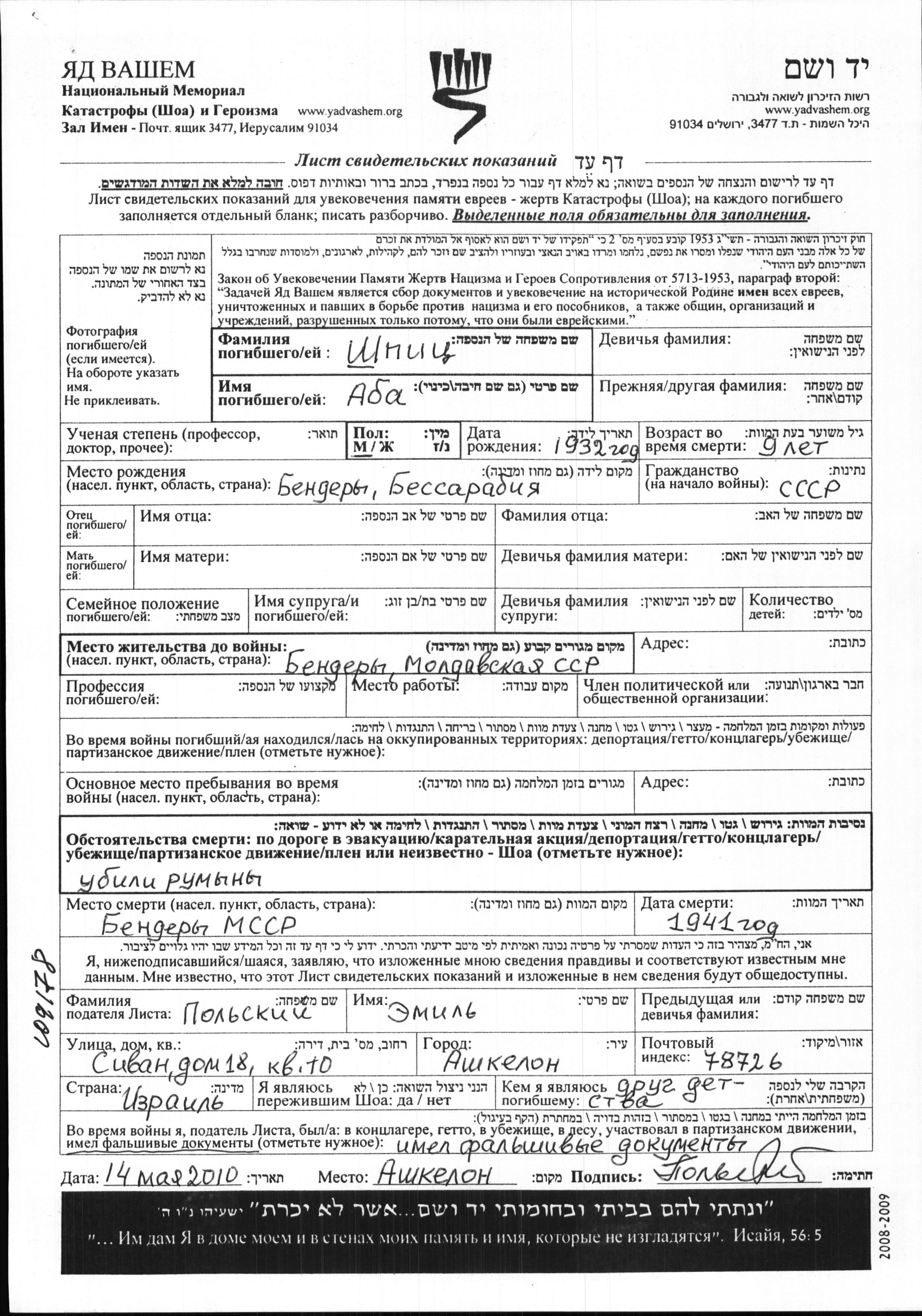 Aba wurde in der Schoah ermordet. Todesort: Benderi, Rumänien im Jahr 1941.