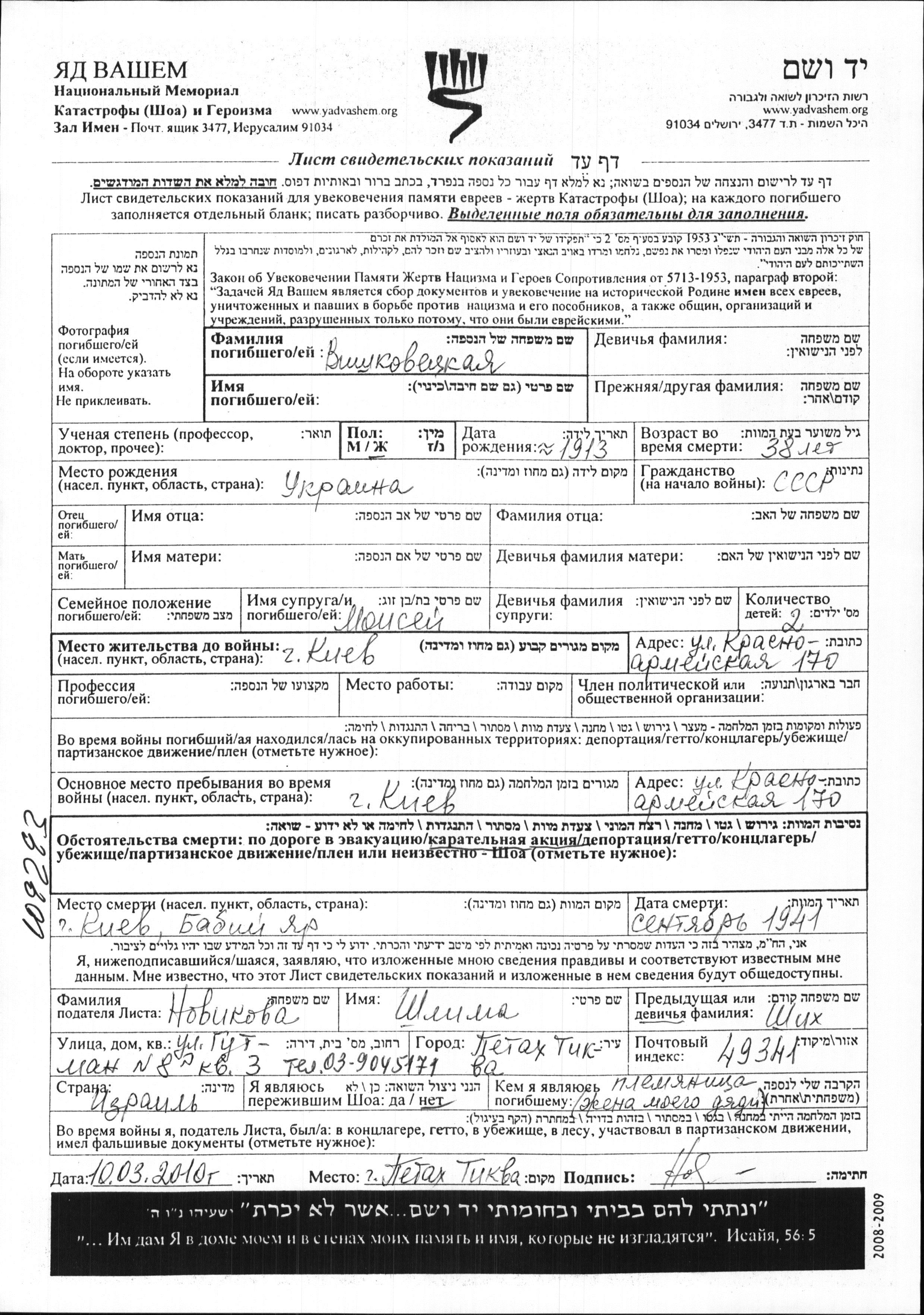 Vorname unbekannt Vishkovetzkaya wurde im Jahr 1913 in Ukraine (UdSSR) geboren. Sie war mit Moisey Verheiratet. Vor dem Zweiten Weltkrieg lebte sie in Kiev, Ukraine (UdSSR). Während des Krieges war sie in Kiev, Ukraine (UdSSR).