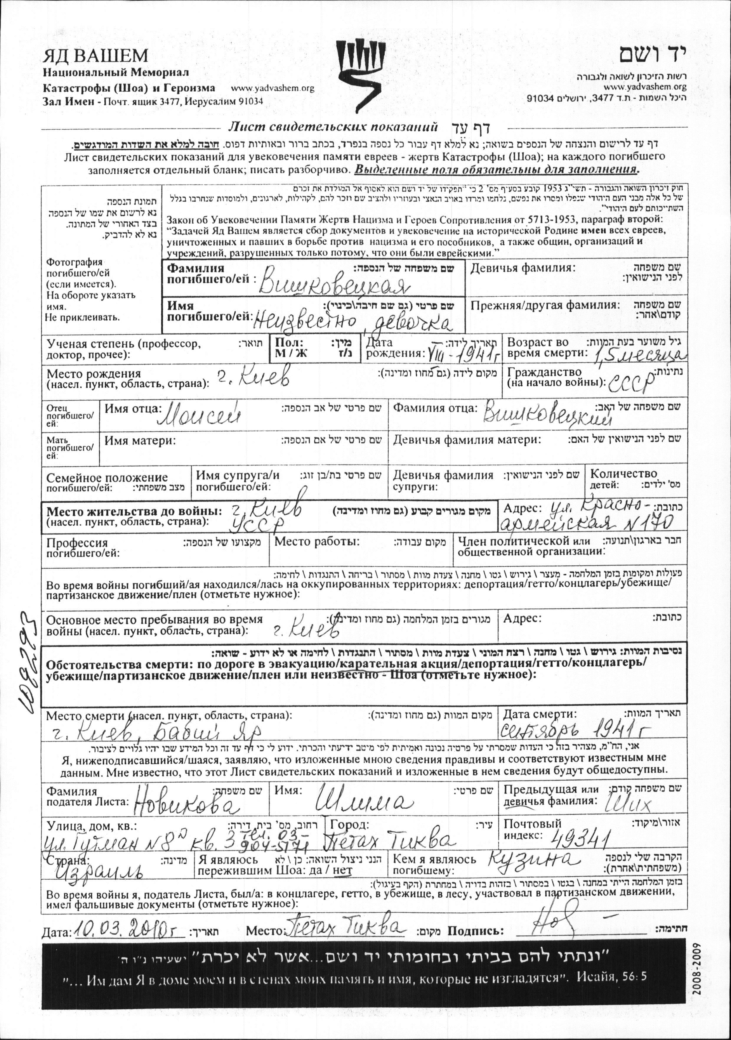 Vishkovetzkaya Vorname unbekannt 1941 Kiev, Ukraine (UdSSR) Gedenkblatt