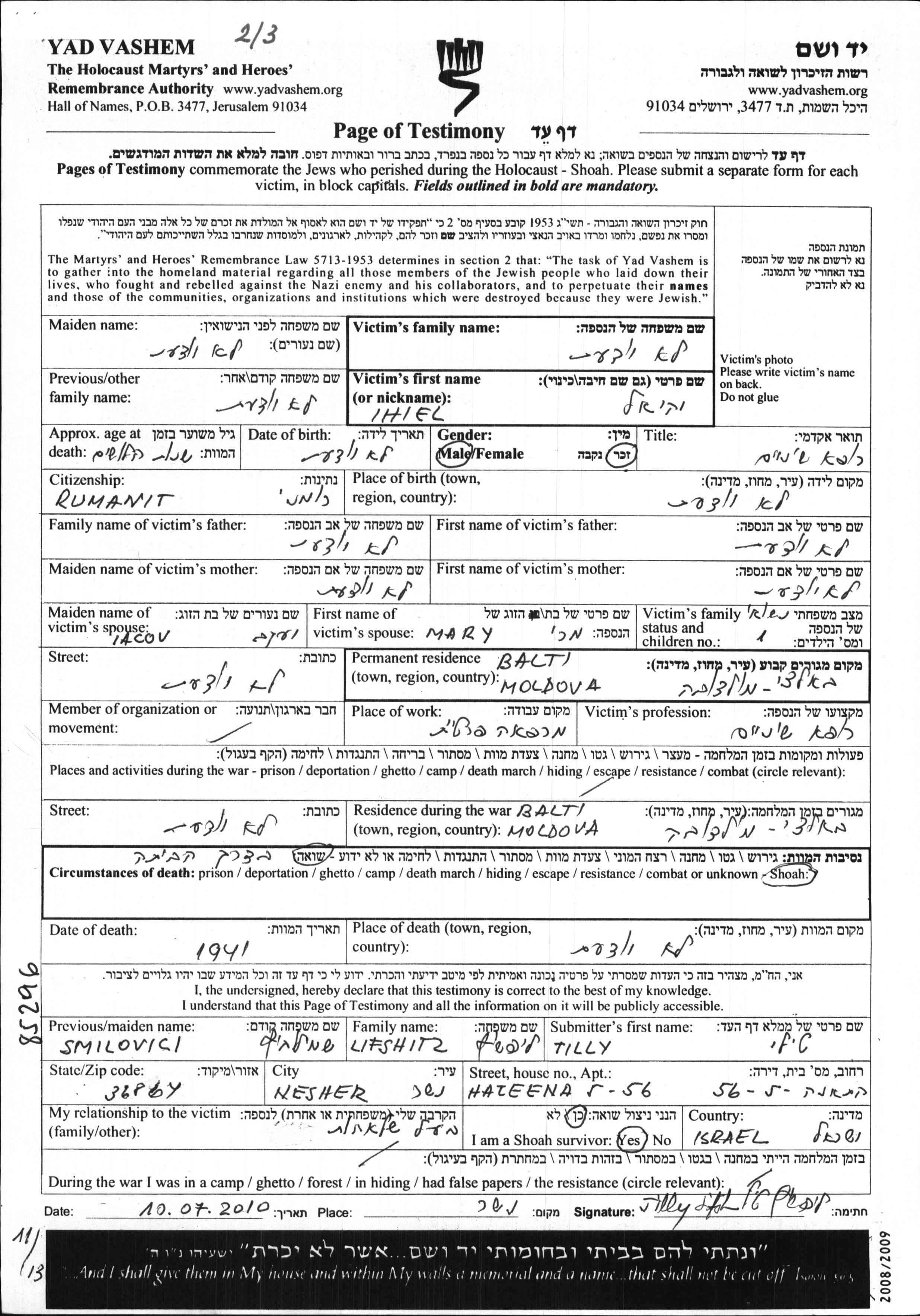 Ihiel Name unbekannt. Er war Dentistin und mit Mary, geb. Iacov Iakov Verheiratet. Vor dem Zweiten Weltkrieg lebte er in Balti, Rumänien. Während des Krieges war er in Balti, Rumänien.