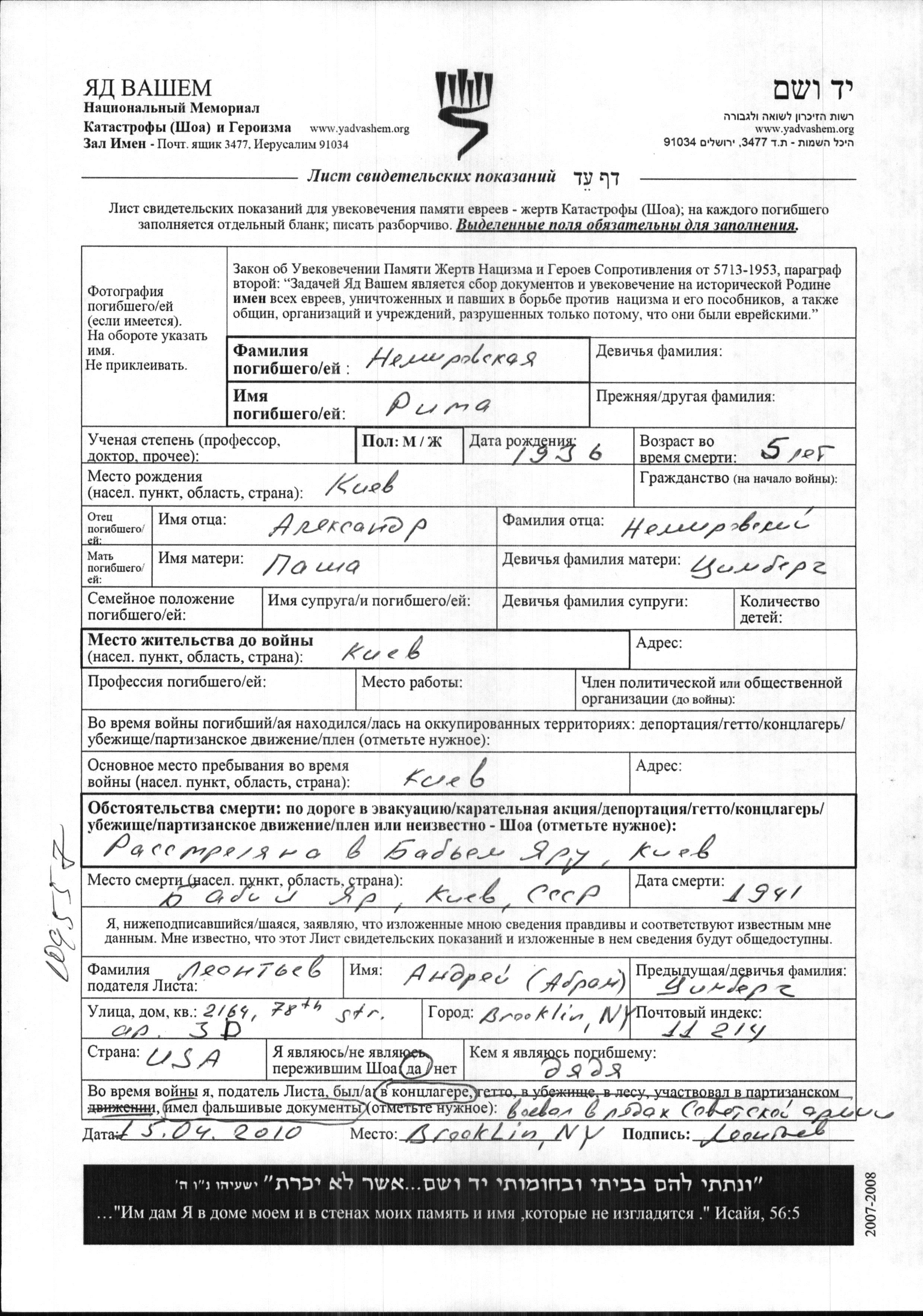 Rita Nemirovskaya wurde im Jahr 1936 in Kiev, Ukraine (UdSSR) geboren. Sie war die Tochter von Aleksandr und Pasha, geb. Tzimberg. Sie war Kind. Vor dem Zweiten Weltkrieg lebte sie in Kiev, Ukraine (UdSSR). Während des Krieges war sie in Kiev, Ukraine (UdSSR).