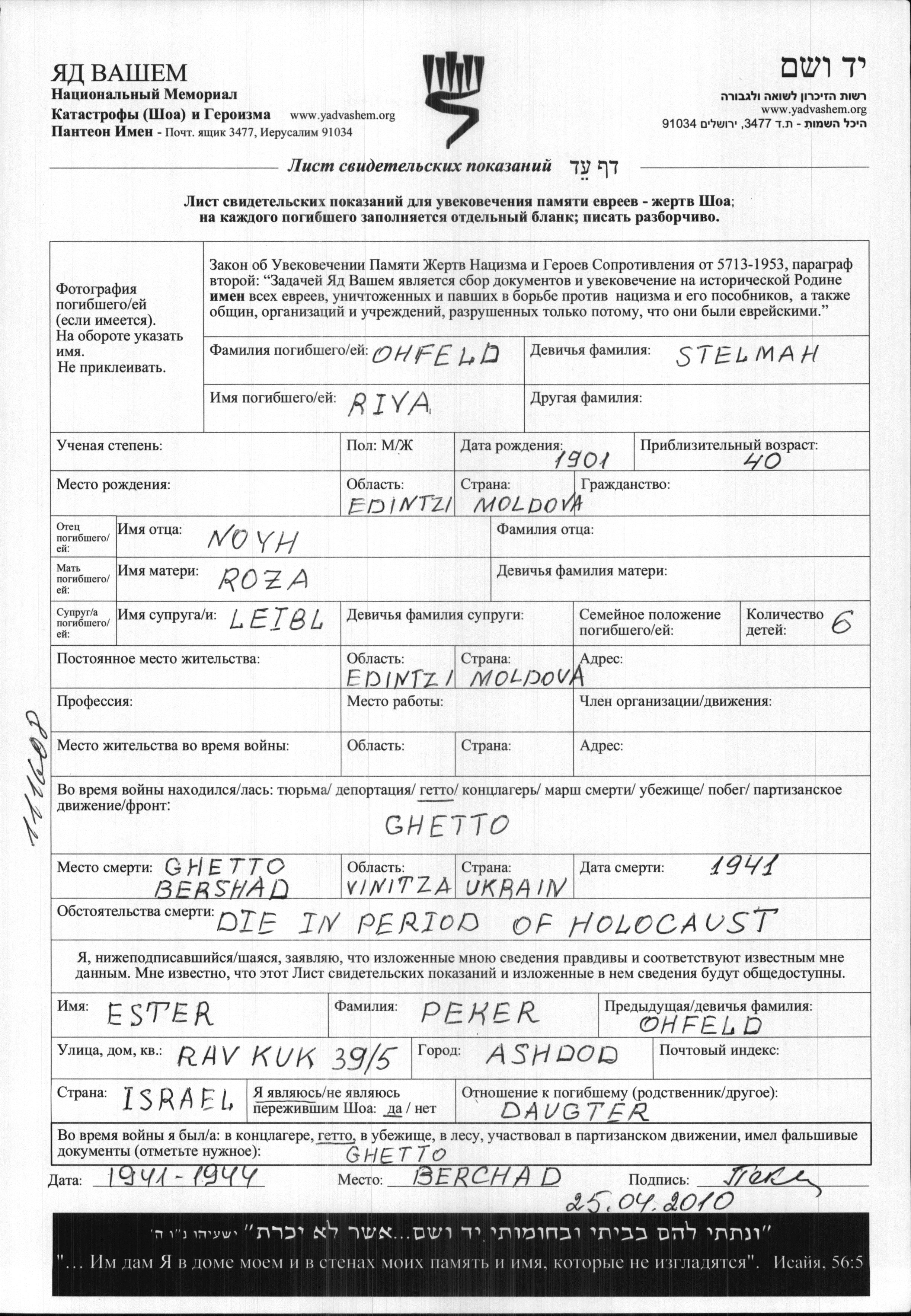 Riva Ohfeld, geb. Stelman wurde im Jahr 1901 in Bessarabia, Rumänien geboren. Sie war die Tochter von Noyh und Roza. Sie war mit Leibl Verheiratet. Vor dem Zweiten Weltkrieg lebte sie in Bessarabia, Rumänien.