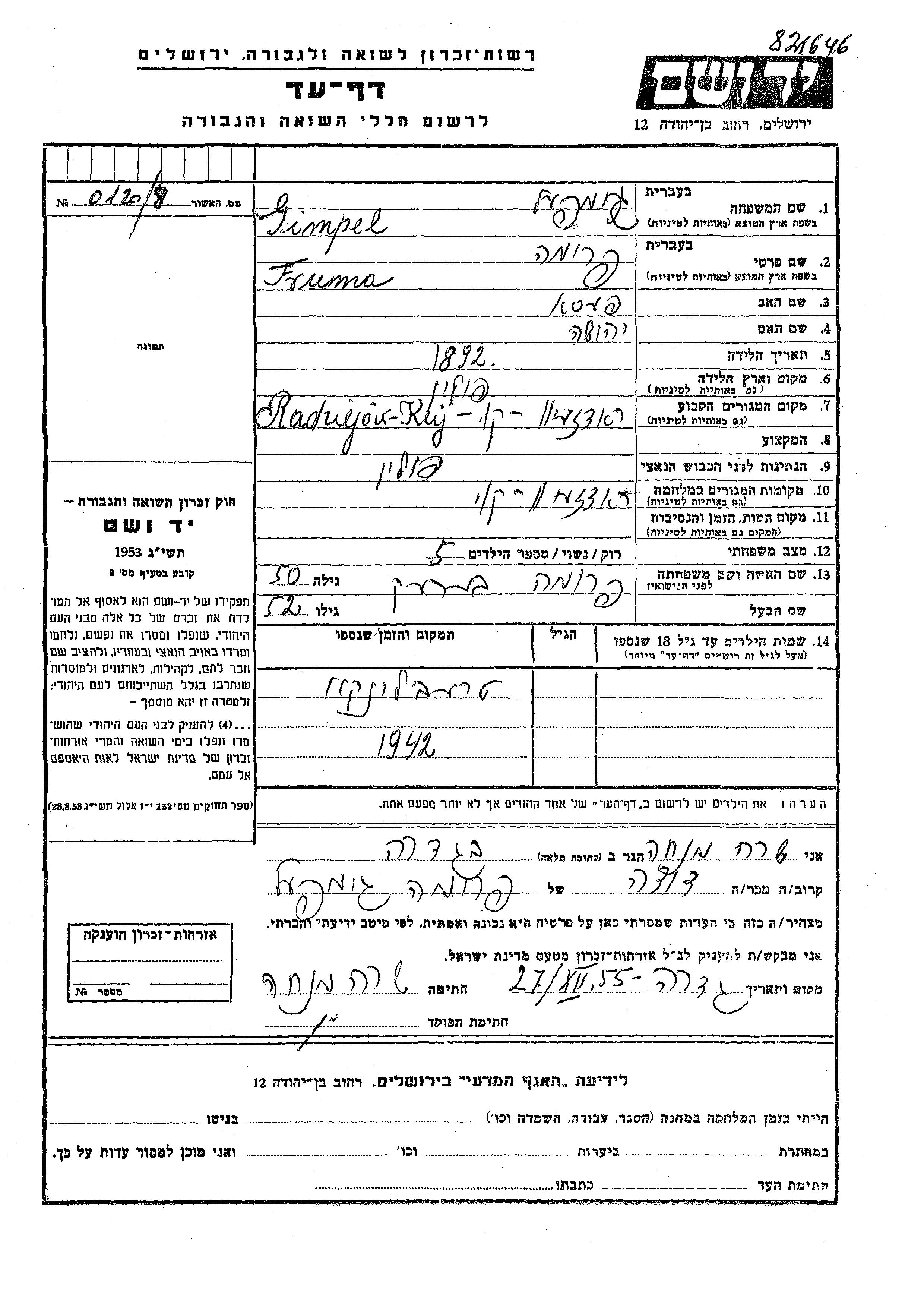 Fruma Gempel, geb. Berek wurde im Jahr 1892 in Polen geboren. Sie war die Tochter von Pesa und Yehoshua. Sie war Verheiratet. Vor dem Zweiten Weltkrieg lebte sie in Radziejow, Polen. Während des Krieges war sie in Radziejow, Polen.