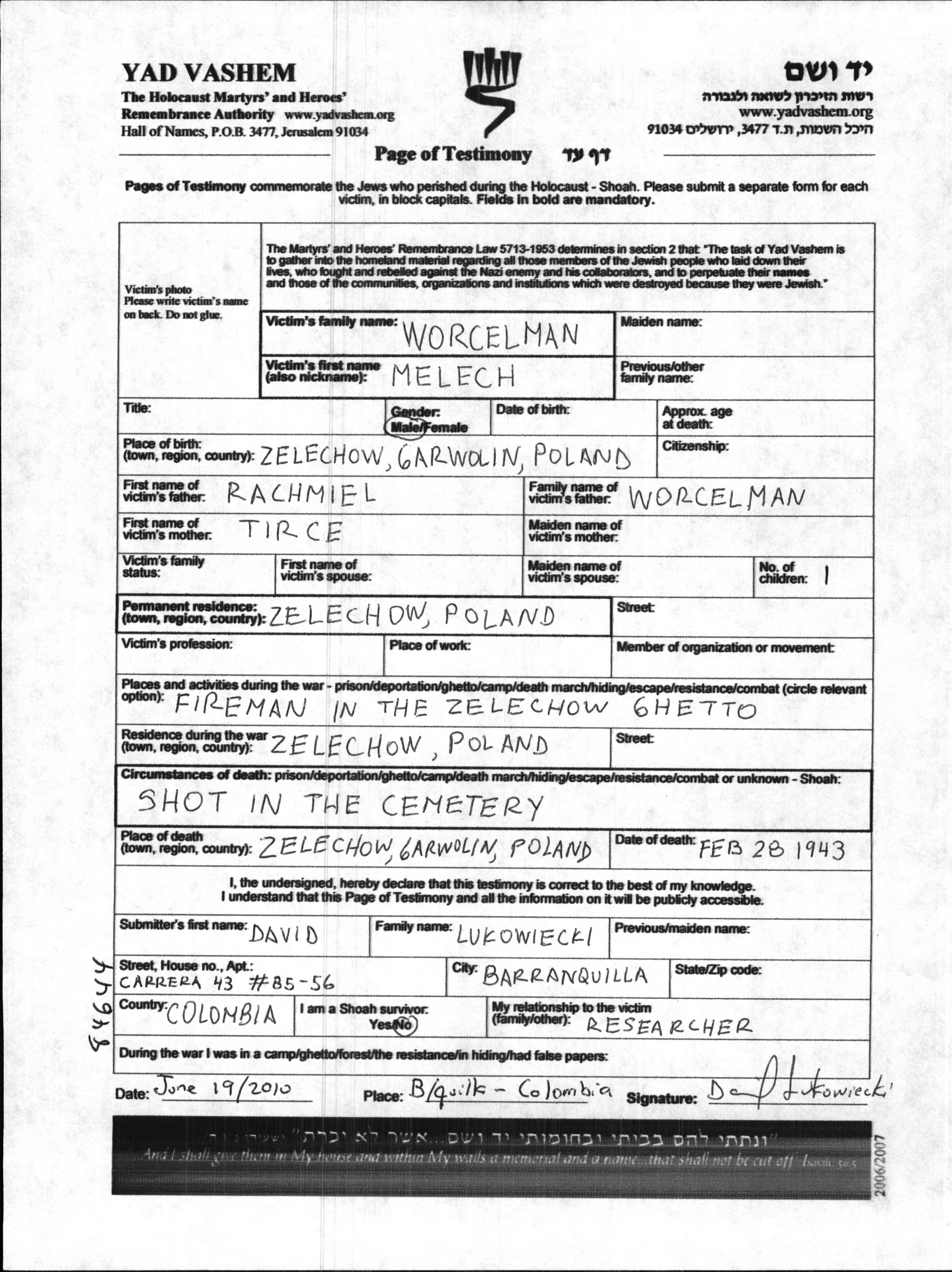 Melech Worcelman wurde in Zelechow, Polen geboren. Er war der Sohn von Rachmiel und Tirce. Vor dem Zweiten Weltkrieg lebte er in Zelechow, Polen. Während des Krieges war er in Zelechow, Polen.